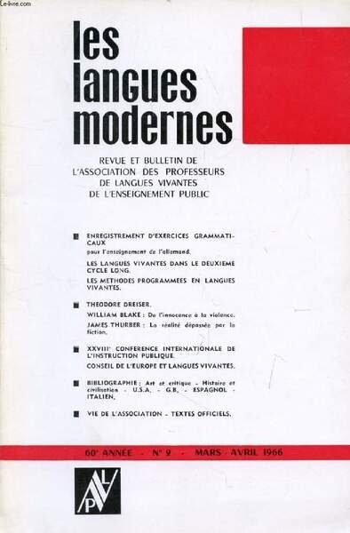 LES LANGUES MODERNES, 60e ANNEE, N� 2, MARS-AVRIL 1966 (Sommaire: ENREGISTREMENT D'EXERCICES GRAMMATICAUX pour l'enseignement de l'allemand. LES LANGUES VIVANTES DANS LE DEUXIEME CYCLE LONG. LES METHODES PROGRAMMEES EN LANGUES VIVANTES. THEOD. DREISER.)