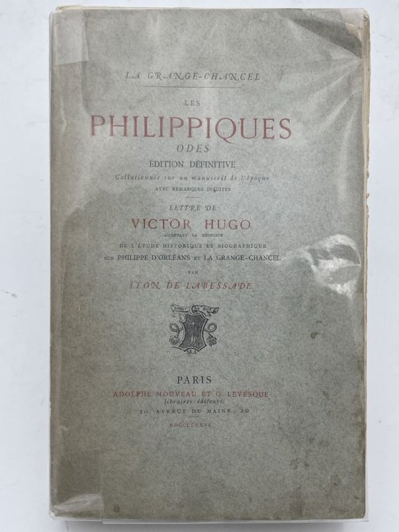 Adolphe Moveau et 1876 Paris, Adolphe Moveau et G Levesqie, 1876. In-8 broché de XVI + 525 pages non coupées. Edition définitive collationnée sur un manuscrit de l'époque avec remarques inédites. Lettres de Victor HUGO acceptant la dédicace de l'étude historique et biographique sur le Duc d'ORLEANS et LA GRANGE-CHANCEL par Léon de LABESSADE. Dos cassé et la dernière de couverture détaché. Intérieur frais
