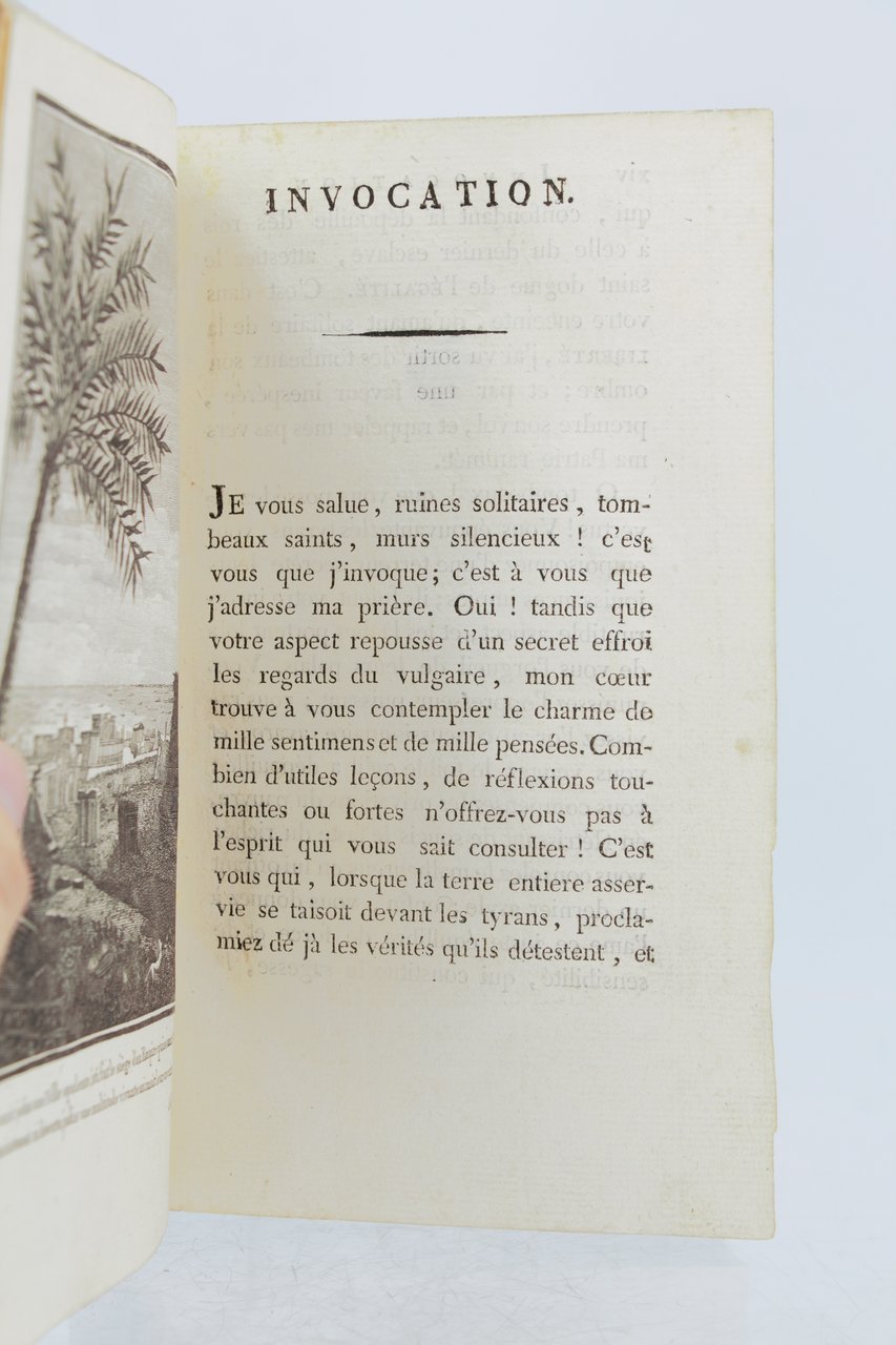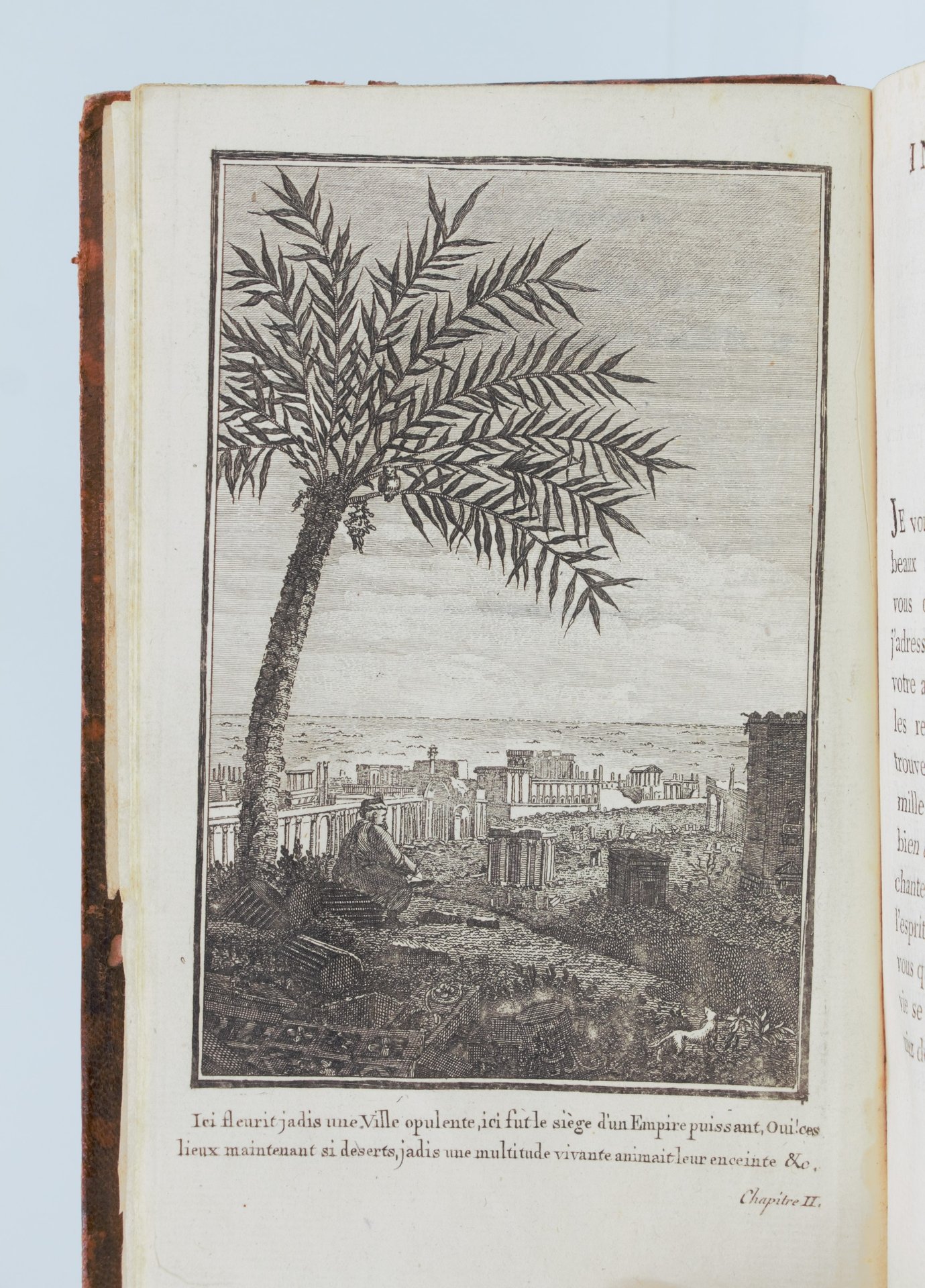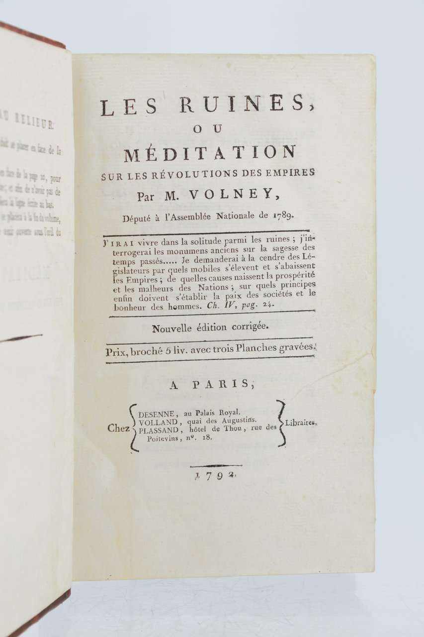 Chez Desenne • Volland • Plassans | à Paris 1792 | 12.50 x 20 cm | relié | [ENGLISH DESCRIPTION ON DEMAND] | Première édition française. L'édition originale est parue à Genève en 1791. llustrée de 3 planches, un frontispice et deux dépliantes : une carte hémisphérique et une astrologique. Reliure en pleine basane marbrée d'époque. Dos lisse orné. Pièce de titre en maroquin rouge. Coiffe supérieure élimée. Frottements aux mors et bordures. Célèbre oeuvre du philosophe Volney dans laquelle alternent souvenirs personnels, philosophie et réflexions. Si le sujet général est un questionnement sur la disparition et la ruine des empires (Volney débute son livre par une méditation sur l'effondrement de Palmyre), l'ouvrage aborde de multiples thèmes qui lui sont liés : origines des cultes religieux, symbolisme, culte des astres. Le livre excelle par son style lyrique et ses allégories. Volney, se souvenant d'Hérodote, ne fait confiance en tant qu'historien qu'aux faits, et il interroge les ruines afin qu'elles lui révèlent la ruine d'un empire et d'une cité.