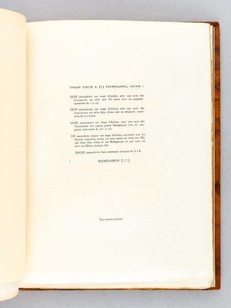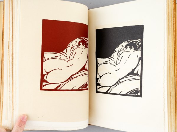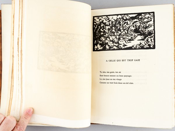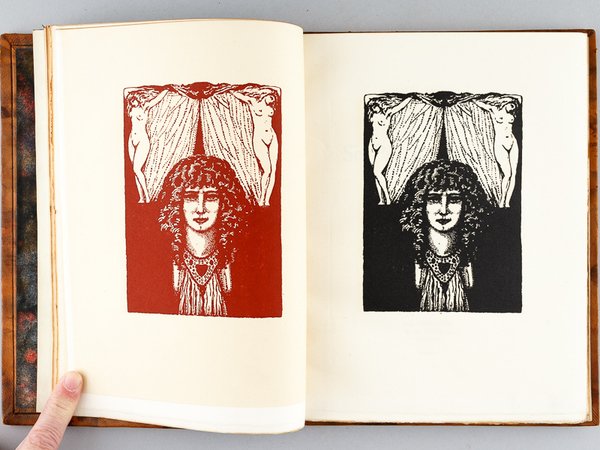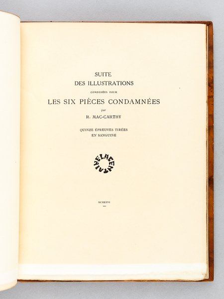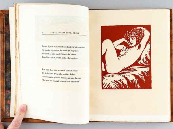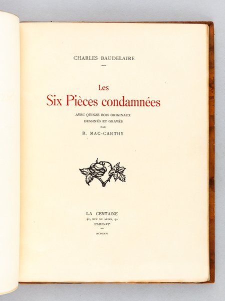 Avec Quinze bois originaux dessinés et gravés par R. Mac Carthy, tirage limité à 313 exemplaires, un des 100 exemplaires sur vergé d'Arches, avec une suite des illustrations sur papier pelure Madagascar tirée en sanguine numérotés (n°213), 1 vol. grand in-8 carré reliure de l'époque plein veau marbré, dos à 3 nerfs (dont deux doubles), tête dorée, couvertures conservées, La Centaine, Paris, 1926, 63 pp. et planches Belle édition établie dans une reliure de qualité. Etat très satisfaisant (reliure un peu frottée avec petites épidermures, une griffure au premier plat, très bon état par ailleurs) pour cette édition qui réunit les 6 poèmes condamnés dans l'édition originale des Fleurs du Mal : Les Bijoux ; le Léthé ; A celle qui est trop gaie ; Lesbos ; Femmes damnées ; les Métamorphoses du Vampire.