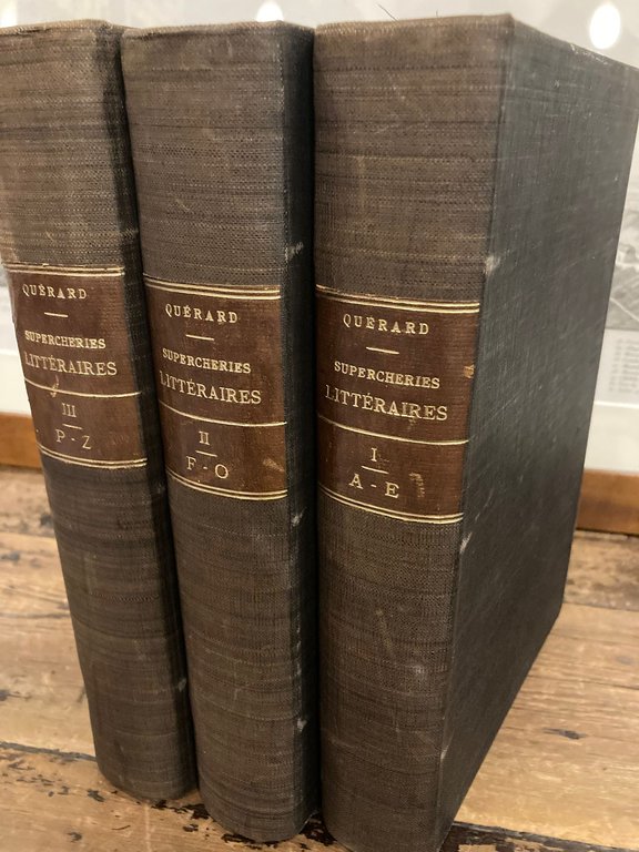3 voll. in-4° (26x18 cm), pp. (8), colonne 1278; pp. (4), coll. 1324, pp. (2); pp. (4), coll. 1290, pp. (3), tutta tela melanzana posteriore con titoli, tomaisons e filetti dorati su tasselli ai dorsi. Conservati i piatti delle brossure originali. Testo ripartito su due colonne divise da doppio filetto nomenclatore alfabetico. Minimi segni del tempo e d' uso ma più che buoni esemplari. Seconda edizione (la famosa 'edizione Daffis'), curata da Gustave Brunet e da Pierre Jannet e ampliata rispetto all'originale, della celebre opera bibliografica del Quérard su ogni sorta di mistificazioni letterarie, enorme e tuttora benemerito regesto di migliaia di pubblicazioni anonime e pseudonime. Il Brunet ebbe a definirla 'ouvrage curieux, quoique dans ses révelations indiscrètes il se trouve bien de choses hasardées et des critiques plus malveillantes que justes, ce qui pourtant n'a pas nui au succès de l'ouvrage'. Il Quérard (Rennes, 1797-Parigi, 1865), illustre bibliografo, è oggi noto eminentemente per la presente opera e per l'altra imponente fatica della 'France Littéraire'. Cfr. Totok/Weitzel I, 311: 'Verzeichnet in alphabetischer Folge Pseudonyme, Initialen, Anagramme und in besonderen Anhängen Asteronyme und latinisierte Namen, zusammen mit ca. 20 000 Eintragungen'. Malcles, 1.132. Vicaire, 6.890. Sheehy, AA150. Schneider, 462. Besterman, 402: 'The last and best edition, valid to the present day, is the third, edited by his son, Olivier Alexandre Barbier and Rene and Paul Billard, 4 vols., 1872-1879, from which the pseudonyma were excluded, as these had already been treated in the second (really the third) edition of 'Les Supercheries Litteraires Devoilees' by Joseph Marie Querard, edited by Gustave Brunet and Pierre Jannet, 3 vols., 1869-1870. In 1889 Brunet published a supplement to both works. These three works are often refereed to as 'Edition Daffis', after the name of their publisher, Paul Daffis'. Breslauer & Folter, 117. Cfr. Vallée, 5304 (prima edizione in 5 voll. del 1847-1853). Brunet, IV, 1011. Graesse, V, 521-522: 'Cet ouvrage. ne rend pas du tout inutile celui de Barbier, quoiqu'il soit plein d'érudition et de notices intéressantes'.
