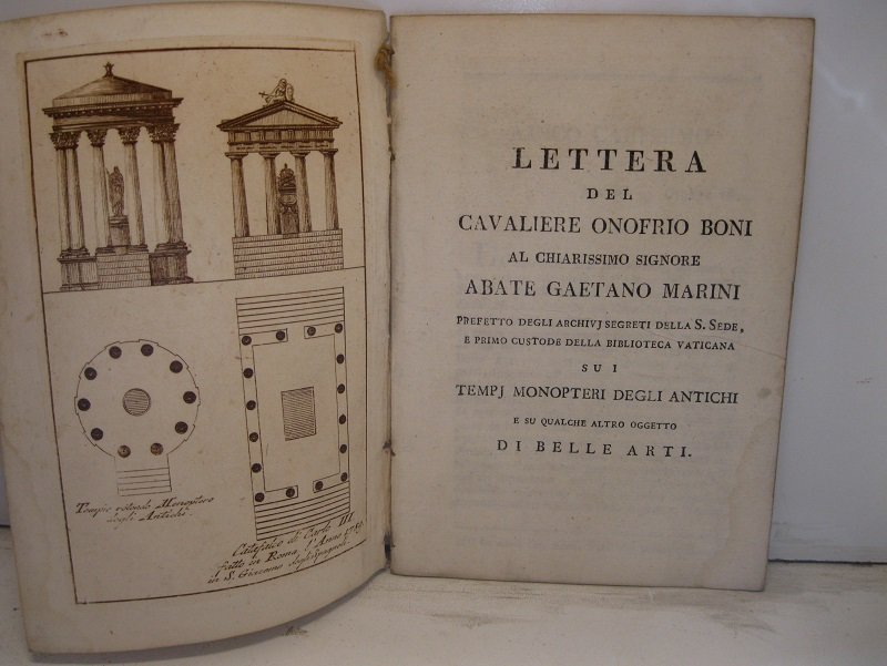 Lettera al chiarissimo signore Abate Gaetano Marini prefetto degli archivj segreti della S. Sede e primo custode della Biblioteca Vaticana sui tempj monopteri degli antichi e su qualche altro oggetto di belle arti | Libri antichi e moderni | Boni Onofrio
