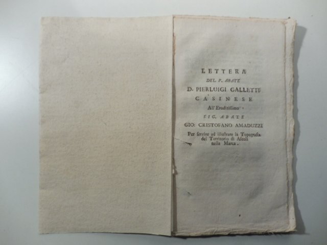 Lettera del P. abate D. Pierluigi Galletti casinese all'euditissimo Sig. abate Gio. Cristofano Amaduzzi per servire ad illustrare la topografia del territorio di Ascoli nella Marca | Libri antichi e moderni | Galletti Pierluigi