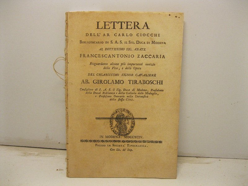 Lettera dell'ab. Carlo Ciocchi bibliotecario di S. A. S. il sig. Duca di Modena al dottissimo sig. abate Francescantonio Zaccaria risguardante alcune piu' importanti notizie della vita e delle opere del chiarissimo Signor Cavaliere Ab. Girolamo Tiraboschi | Libri antichi e moderni | Ciocchi Carlo