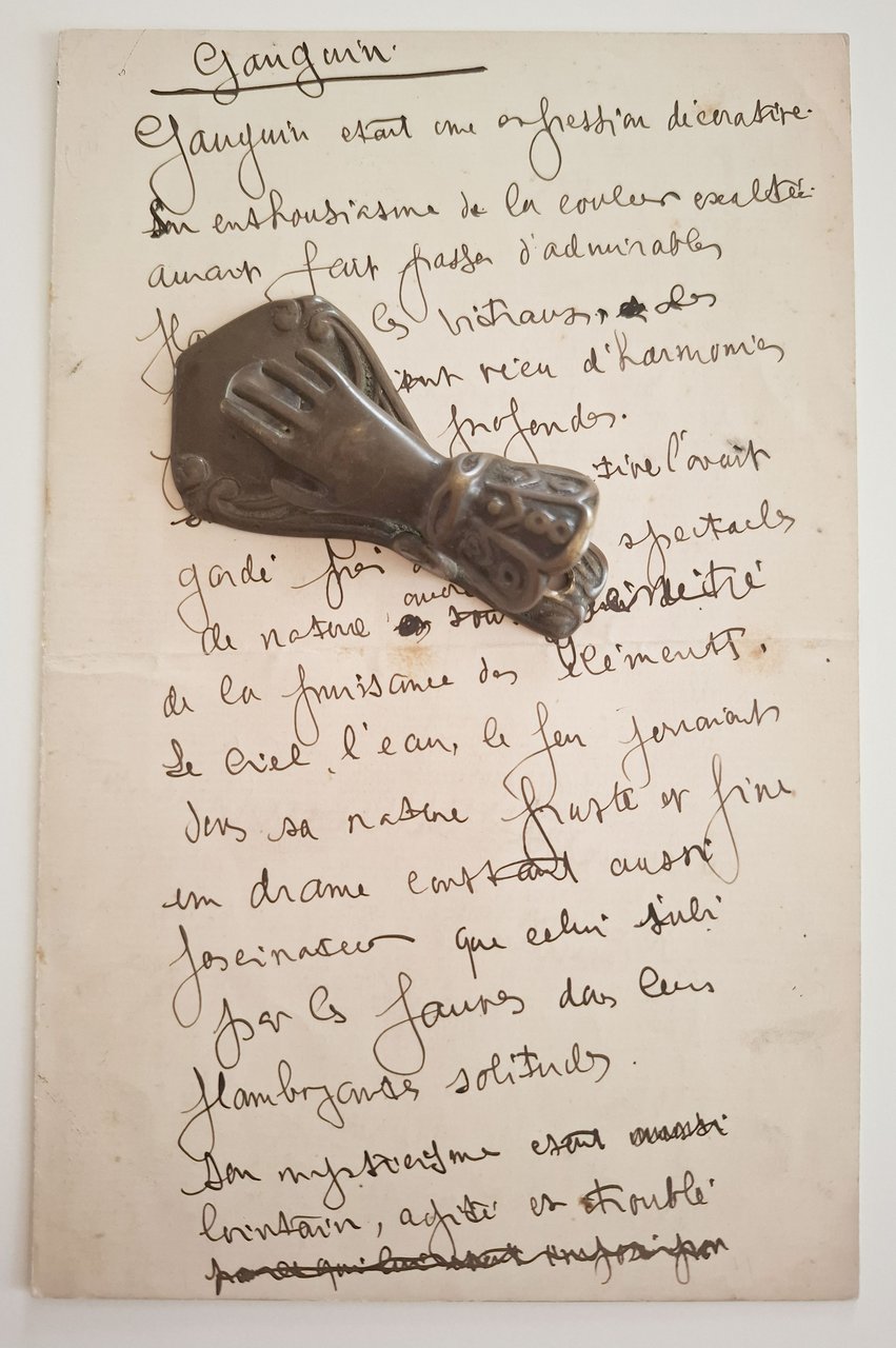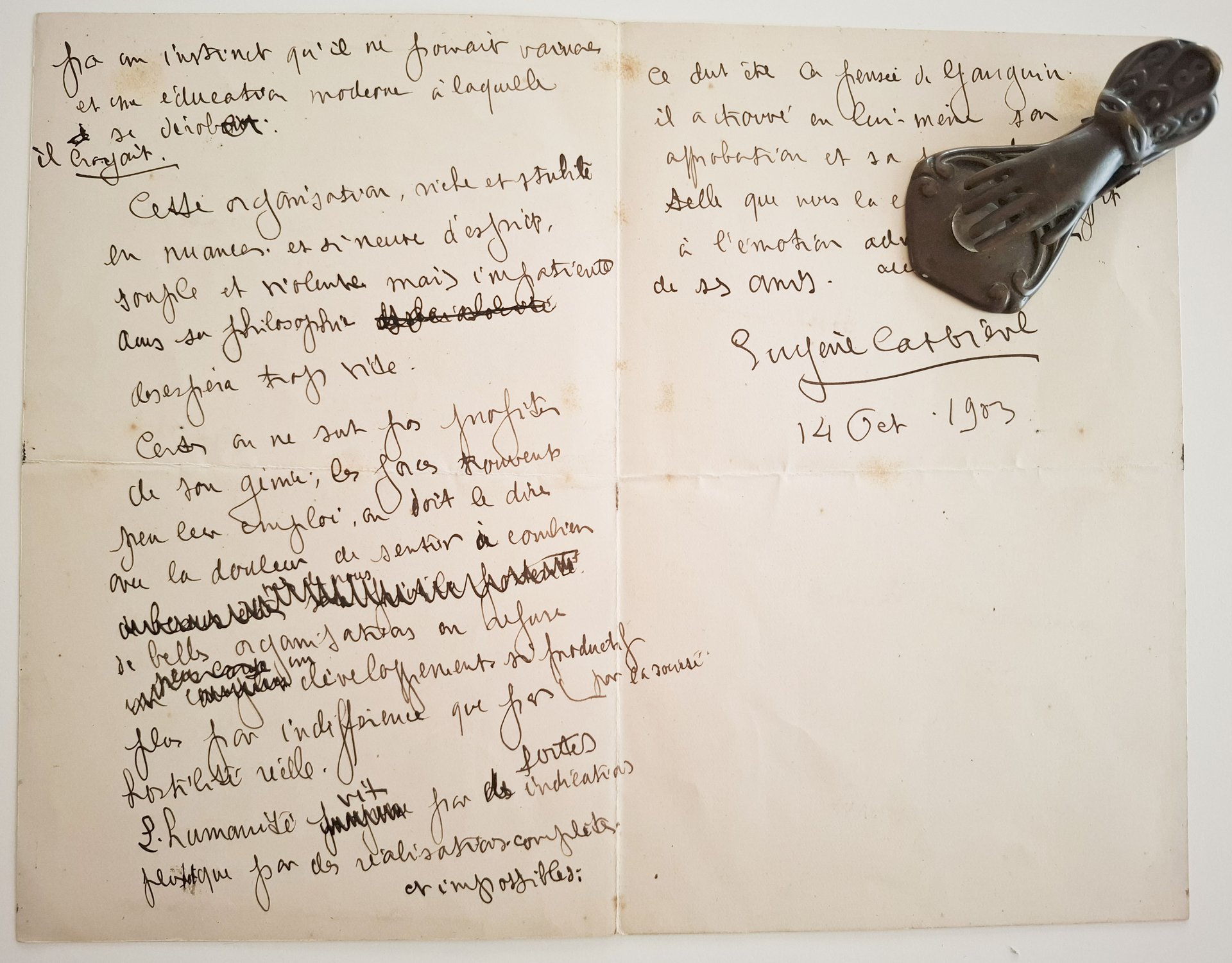 Lettera manoscritta di 4 pagine, delle quali tre scritte, datata '14 Oct. 1903', con autografo originale, a penna, del pittore francese, esponente del movimento simbolista, Eugene Carriere (1849 - 1906). Testo della lettera in lingua francese. La lettera è stata, presumibilmente, spedita in quanto sono presenti lineee di piegatura. Qualche segno del tempo e dell'uso ma, nel complesso, decisamente buono. Formato della lettera chiusa: 11,5 x 18 cm circa. L'intero scritto è dedicato a Paul Gaugin, morto qualche mese prima, di cui Carriere fu amico. Di Gauguin eseguì anche un ritratto.