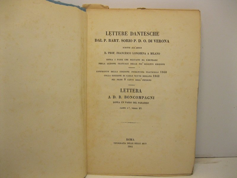 Lettere dantesche del P. Bart. Sorio P. D. O. di Verona scritte all'amico il prof. Francesco Longhena a Milano sopra i passi che restano da emendare nella lezione testuale delle piu' recenti edizioni. Confronto della edizione fiorentina Fraticelli 1860 colla edizione di Carlo Witte Berlino 1862 nei primi 8 canti dell'Inferno. Lettera di a D. B. Boncompagni sopra un passo del Paradiso, canto I, verso 43 | Libri antichi e moderni | Sorio Bartolomeo