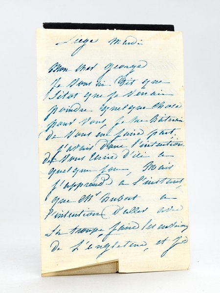 Lettre autographe signée : "Liège, Mardi. Mon Cher George, Je vous ai dit que sitôt que je verrai poindre quelque chose pour vous, je me hâterai de vous en faire part. J'avais donc l'intention de vous écrire d'ici à quelques jours, mais j'apprends à l'instant que M. Bubat a l'intention d'aller sa troupe faire les environs de l'Angleterre, et je viens vous demander si la nouvelle est véritable car dans ce cas, cela changerait bien des choses qui se mijotent. Ecrivez-moi donc tout de suite sur le fait, je vous en prie. Sachez donc aussi sans parler de moi [ souligné ] si Legreney a reçu oui ou non une lettre de Mr Lémençon [ ? ] lettre à laquelle il n'aurait point répondu, ce qui a beaucoup étonné ce dernier [ . ]