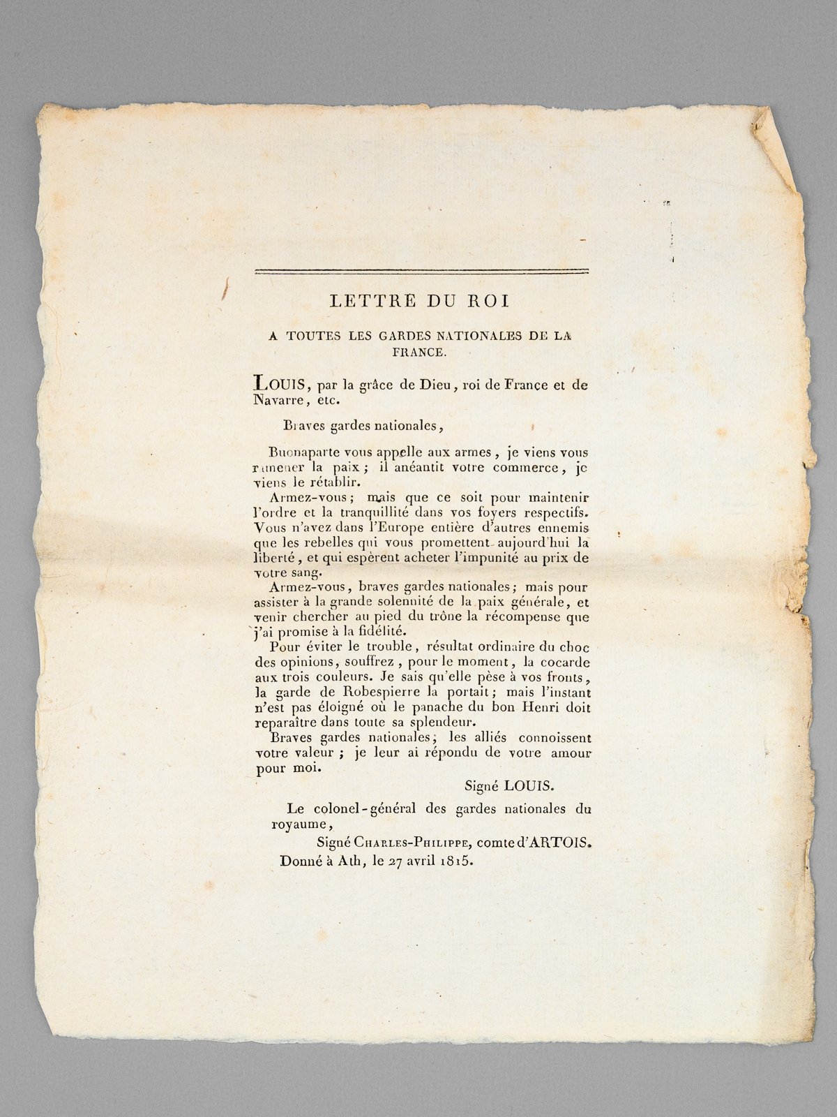 1 placard format 26 x 21,2 cm, s.n., Ath, 27 avril 1815 : Lettre du Roi à toutes les Gardes Nationales de la France. [ Donné à Ath, le 27 avril 1815 ] Braves gardes nationales, Buonaparte vous appelle aux armes, je viens vous ramener la paix ; il anéantit votre commerce, je viens le rétablir. Armez-vous ; mais que ce soit pour maintenir l'ordre et la tranquillité dans vos foyers respectifs. Vous n'avez dans l'Europe entière d'autres ennemis que les rebelles qui vous promettent aujourd'hui la liberté, et qui espèrent acheter l'impunité au prix de votre sang. [ . ] Pour éviter le trouble, résultat ordinaire du choc des opinions, souffrez, pour le moment, la cocarde aux trois couleurs. Je sais qu'elle pèse à vos fronts, la garde de Robespierre la portait ; mais l'instant n'est pas éloigné où le panache du bon Henri doit reparaître dans toute sa splendeur. Braves gardes nationales ; les alliés connoissent votre valeur ; je leur ai répondu de votre amour pour moi". Très intéressante lettre publiée par Louis XVIII lors de son exil à Gand pendant les Cent Jours. On notera la mention de Robespierre et l'acceptation de la cocarde tricolore. Le document porte les noms du roi Louis et de son frère le comte d'Artois, "colonel-général des gardes nationales du royaume". Etat très satisfaisant (pliure centrale avec petits frott.). On peut rapprocher ce document de la brochure adressée "Aux Gardes Nationales de France", de l'Imprimerie royale en exil à Gand, et visible dans notre catalogue.
