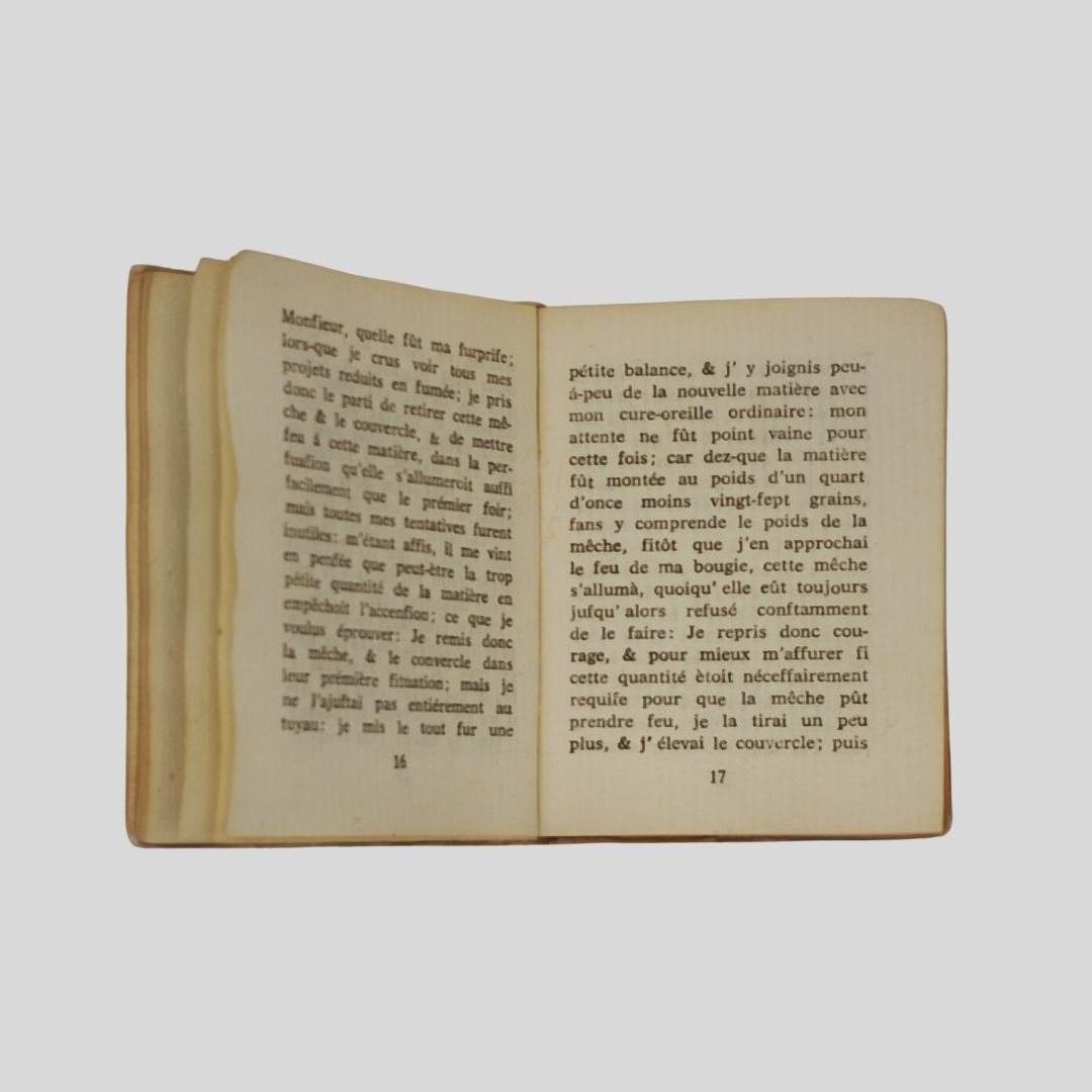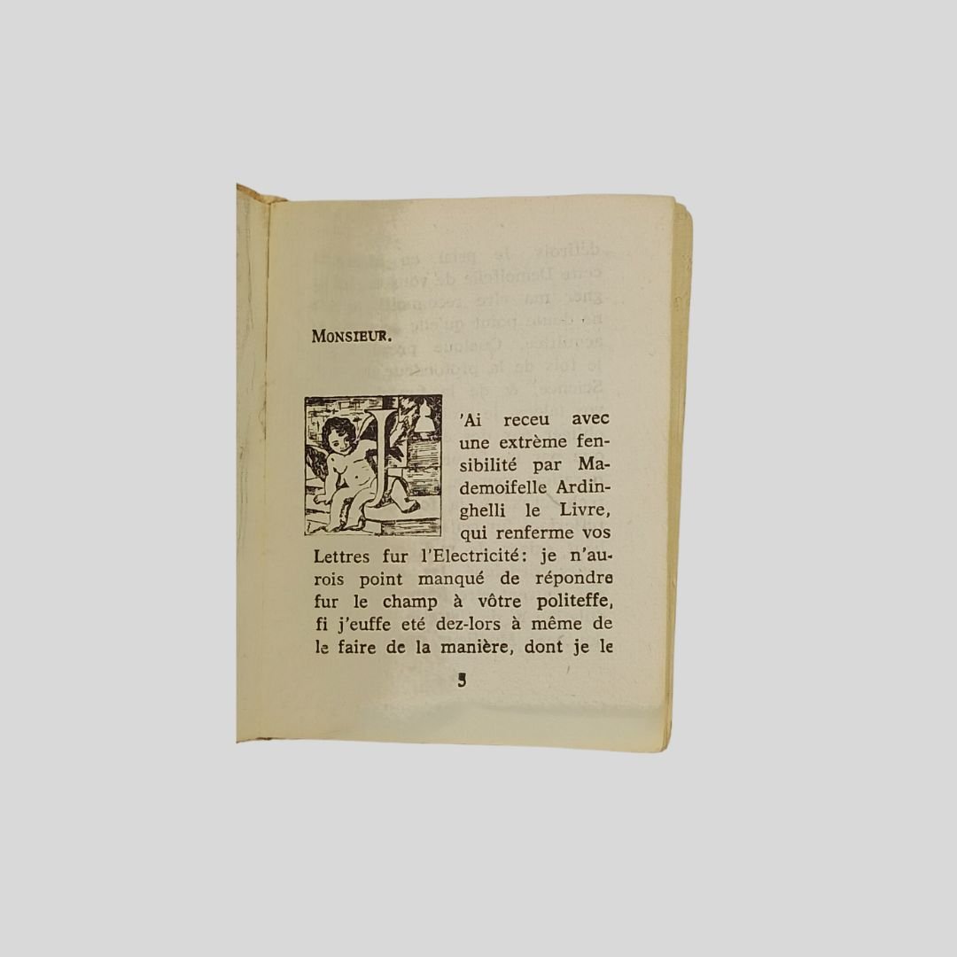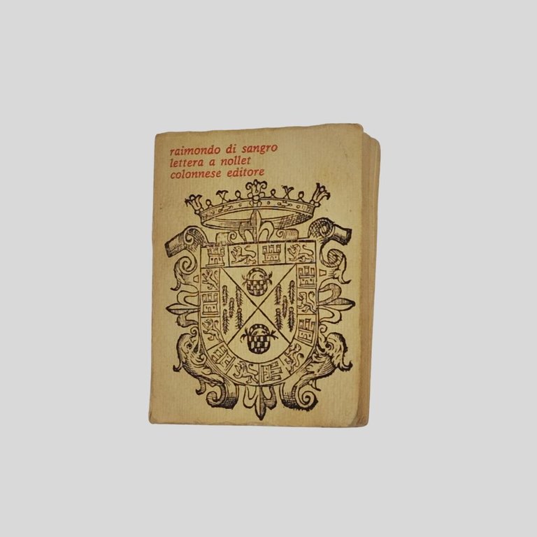 In-32, cm 7,6×5,7. Compless. 140 pagine; pp. 30 (testo in francese) +XXXVII (traduzione)+5 n.n.+a-n (postfazione)+8 n.n. Ritr. di Raimondo di Sangro all’antip. La prima parte è stampata su carta originale del Settecento ed è tratta dall’edizione pubblicata à Naples, chez Joseph Raimondi, 1753. La seconda parte è stampata al solo recto di carta velina di differenti colori. Esemplare con tracce d’uso. Molto raro. Raimondo di Sangro Lettera a Nollet. Collana I Lilliput Colonnese, tra tradizione e sperimentazione. «Di questo sestosettimo Lilliput scelto da Luciano Caruso sono stati impressi duecento esemplari numerati a mano […] l’impostazione grafica è stata curata da Gaetano Colonnese senza licenza dei superiori & senza privilegio nel luglio del 1970» Esemplare sfuggito alla numerazione. Collana “I Lilliput”, n. 6-7.<BR><BR>Il volume rappresenta uno dei casi più singolari della collana “I Lilliput”, combinando materiale antico e intervento editoriale contemporaneo. La compresenza di supporti differenti restituisce un oggetto che si colloca tra riproduzione e rielaborazione, coerente con la logica sperimentale del progetto.