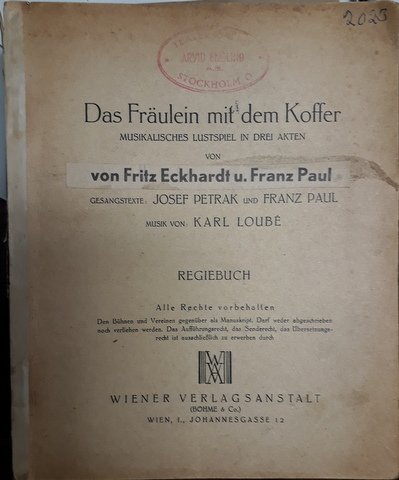 [Libretto] Das Fräulein mit dem Koffer. Musikalisches Lustspiel in drei Akten von Franz Paul [auf Umschlag überklebt mit Zettel "Von Fritz Eckardt u. Franz Paul"]. Gesangstexte: Josef Petrak und Franz Paul. Regiebuch. Den Bühnen und Vereinen gegenüber als Manuskript