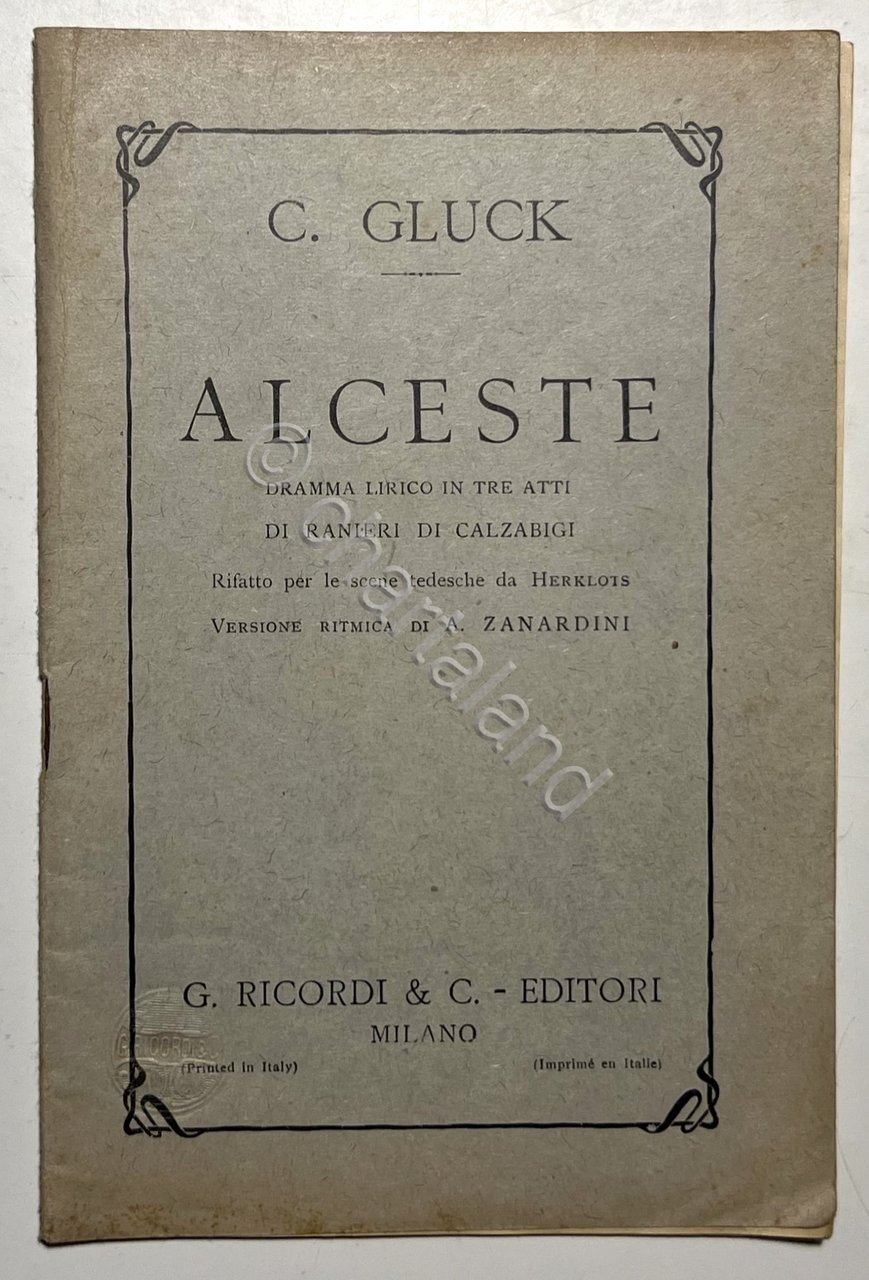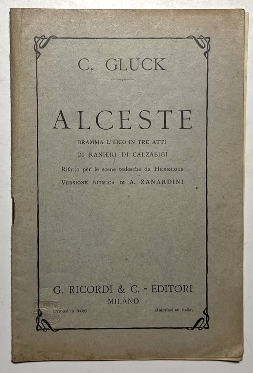 Libretto Opera - C. Gluck - Alceste: Dramma Lirico in Tre Atti - ed. 1910 ca. Ricordi Testo in lingua italiana. Pagine 23 Copertina morbida. Condizioni molto buone con piccoli segni del tempo come da foto.