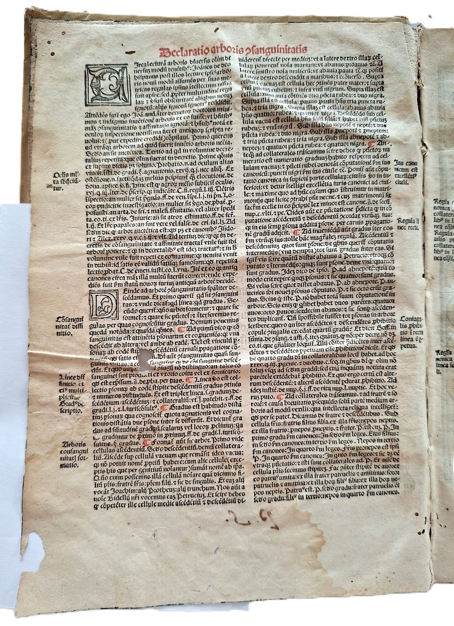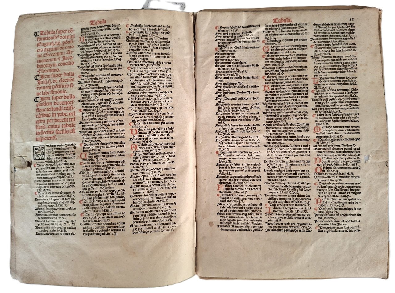 Uno strappo di cm. 4 alla carta 186 del primo tomo. Testo nitido (stampato in rosso e nero), rare fioriture e minimi difetti alle carte, qualche angolo ripiegato. Leggera gora al margine inferiore delle prime 16 carte. Minuscoli lavori di tarlo marginali. Alcune figure in xilografia nel testo. Capilettera xilografici. Cinquecentina impressa in Venezia il 1525 (data al verso della c. 275) per gli eredi di Ottaviano Scoto.