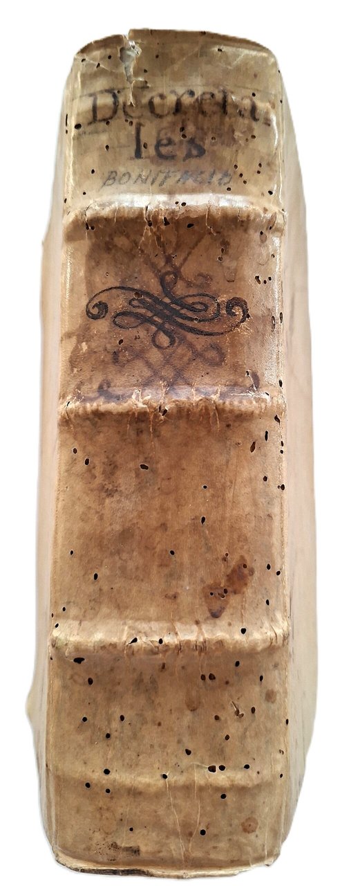 In-8°, cm. 23 x 17, carte 276, + 112, + 64, + 64, + 11. Testo completo, manca l'ultima carta bianca TTT12. Legatura posteriore. (XVII o XVIII sec.) in piena pergamena antica, i piatti rimangono leggermente sollevati, dorso con 5 nervature e titoli manoscritti, legatura con macchie piccoli strappi e mancanze. Tagli delle carte in blu, piccoli fori di tarlo al dorso. Carta ondulata, restauro con mancanze al primo frontespizio che presenta due fori, di cui uno con perdita di testo, foro al margine destro della carta 267 del primo tomo, altro foro, strappo di cm. 4 al margine inferiore della carta 20 del secondo tomo, restauro al margine destro della carta 61 dell'indice del penultimo tomo, uno strappo restaurato al margine destro della carta 10 dell'ultimo tomo, dove è visibile un foro, altro foro al margine destro dell'ultima carta.