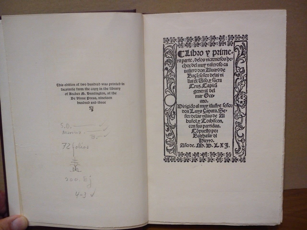 Libro y primera parte, de los victoriosos hechos del muy valeroso cavallero don Alvaro de Baça(n): señor de las villas d(e)l Viso, y sa(n)ta Cruz. Capita(n) general del mar Oceano. Dirigido al muy ilustre señor don Luys Çapata, Señor de las villas de Albuñol, y Torbiscon, con sus partidas. Compuesto por Balthasar del Hierro