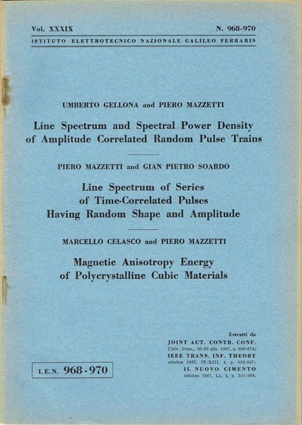N. 968-970, Volume XXXIX della collana Pubblicazioni dell'Istituto Elettrotecnico Nazionale Galileo Ferraris. Buono stato, coperta in carta, qualche segno d'uso, tagli e margini delle pagine appena ambrati, pagine in buono stato. Presenta timbro ex biblioteca su pagina 1, timbro numerale ed ex biblioteca su excipit, figure in nero. Contiene tre scritti, il primo "Line Spectrum and Spectral Power Density of Amplitude Correlated Random Pulse Trains", di Umberto Gellona, Piero Mazzetti, Estratto da Joint Aut. Contr. Conf., Univ. Penn., 20-30 giugno 1967, p. 666-674, di 9 pagine; il secondo "Line Spectrum of Series of Time-Correlated Pulses Having Random Shape and Amplitude", di Piero Mazzetti, Gian Pietro Soardo, Estratto da IEEE Trans. Inf. Theory, ottobre 1967, IT-XIII, N. 4, p. 552-557, di 6 pagine; il terzo "Magnetic Anisotropy Energy of Polycrystalline Cubic Materials", di Marcello Gelasco, Piero Mazzetti, Estratto da Il Nuovo Cimento, ottobre 1967, Vol. LI, N. 2, p. 357-369, di 13 pagine. Numero Pagine 28