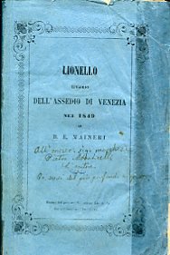 In-16°, pp. 156, (1) di errata, brossura editoriale azzurra con titolo entro bordura. Alla brossura anteriore, dedica autografa del Maineri: 'All'onorev. sig. marchese Pietro Monticelli l'autore co' sensi del più profondo rispetto'. Il piatto posteriore è rifatto in carta azzurra. Dedica a stampa a Eugène Allaix. Buon esemplare. Prima edizione di questo romanzo storico ambientato nell'assedio di Venezia del 1849. Il Maineri (Toirano, Albenga, 1837-Roma, 1892), poligrafo, patriota e giornalista, amico di Mazzini e di Garibaldi, di Saffi e di Cairoli, fu bibliotecario e direttore tecnico del Ministero dei Lavori pubblici nonché direttore di prestigiosi giornali come 'Il Diritto', l'Ateneo Italiano', etc. Scrisse vari libri dedicati alla Liguria, tra cui un notevole studio sui pirati turchi e barbareschi a Ceriale, nonché opere di storia, pedagogia, critica e pura invenzione letteraria. 'Scrittore nervosissimo, amò talora la bizzarria guerrazziana e del Poe, il quale ultimo imità anzi molto felicemente, aiutato da una fervidissima immaginazione' (Angelo De Gubernatis). CLIO, IV, p. 2748. De Gubernatis, Diz. biografico degli scrittori contemporanei, p. 671 (con elenco delle opere del Maineri). <br>