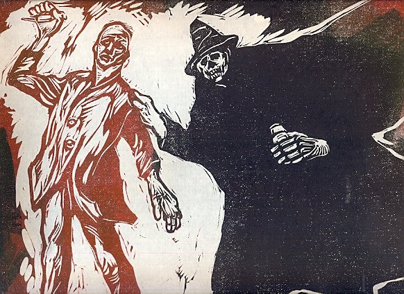 Incisione su linoleum, cm. 27 x 40, su foglio carta fina. 3° stato. Firma in basso a dx.