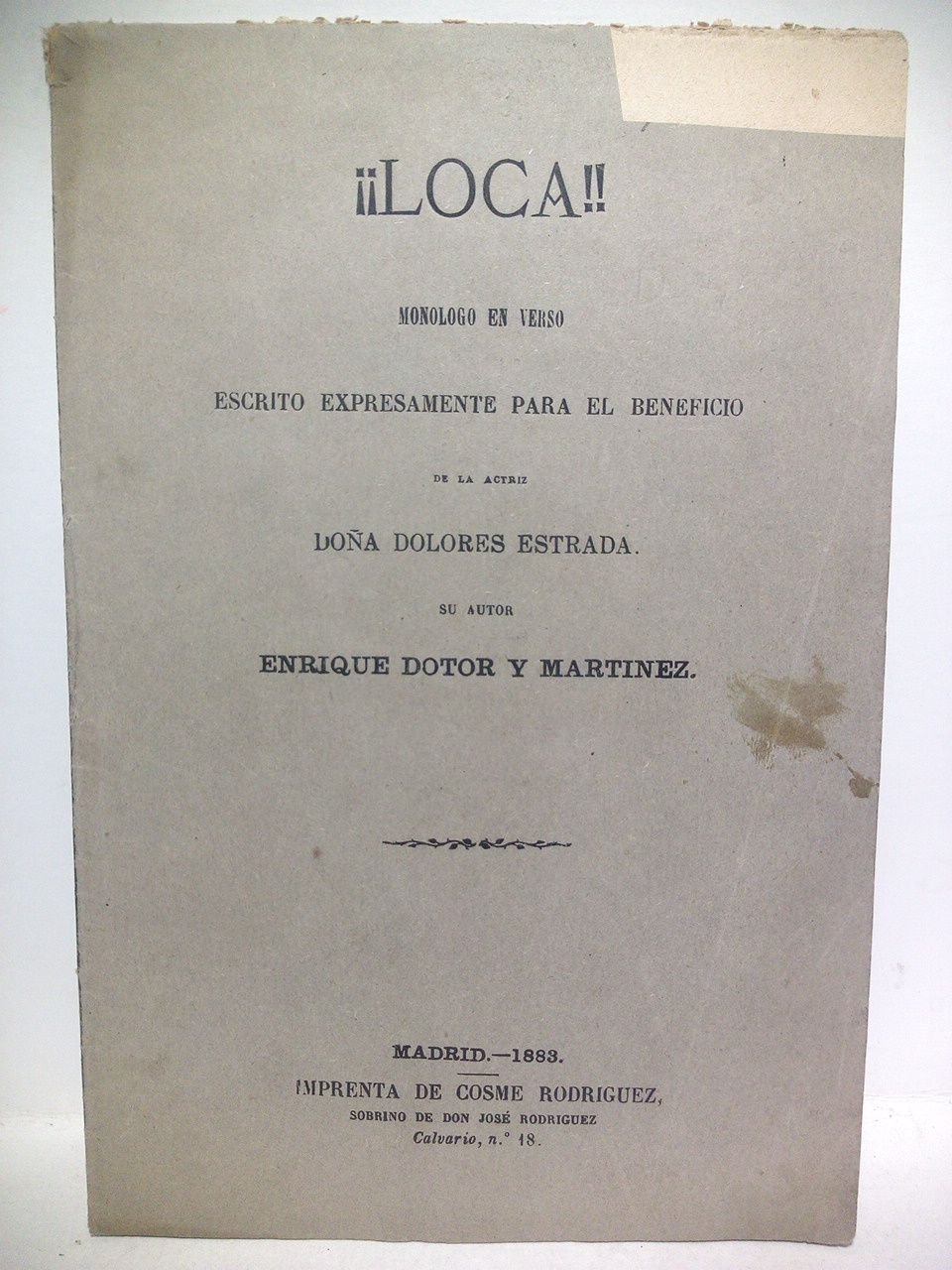¡¡Loca!. (Monólogo en verso escrito expresamente para el beneficio de la actriz Doña Dolores Estrada. Estrenado en la noche del 18 de Agosto de 1882 en el Teatro de Daimiel) | Libri antichi e moderni | Dotor Y Martinez, Enrique