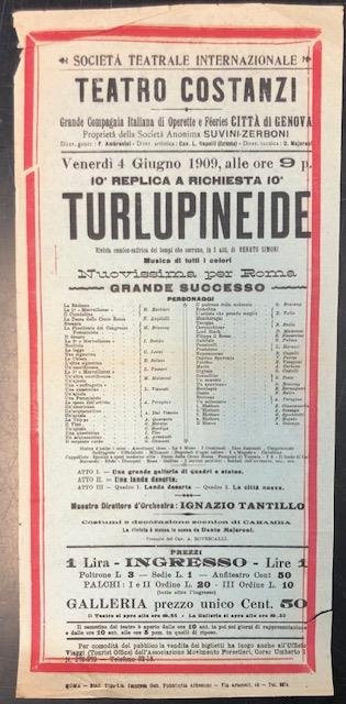 Locandina per la rivista comico - satirica in tre atti "Turlupineide" di Renato Simoni al Teatro Costanzi di Roma, 4 giugno 1909. | Libri antichi e moderni |
