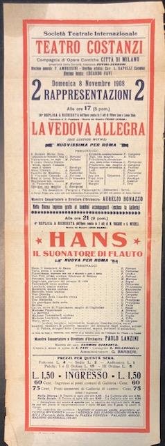 Locandina per le operette "La vedova allegra" di Franz Lehar e "Hans, il suonatore di flauto" M. Vaucaire e G. Mitchell al Teatro Costanzi di Roma, 8 novembre 1908. | Libri antichi e moderni |