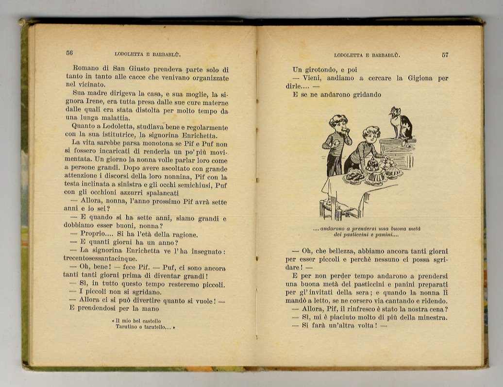 Firenze, Adriano Salani, 5 dicembre 1939, in-16 grande, cartonatura editoriale figurata a colori da Alberto Micheli, pp. 159, [1]. Con illustrazioni nel testo di Raymond de La Nezière. Georges Louza è lo pseudonimo di Marie Ernestine Perrault. Titolo n. 44 della "Biblioteca dei miei ragazzi", una delle più famose collane di libri per bambini dagli anni Trenta agli anni Cinquanta. Prima versione del volume nella collana (con le illustrazioni di Raymond de La Neziére). Firma di possesso sul frontespizio, per il resto ottimo esemplare.