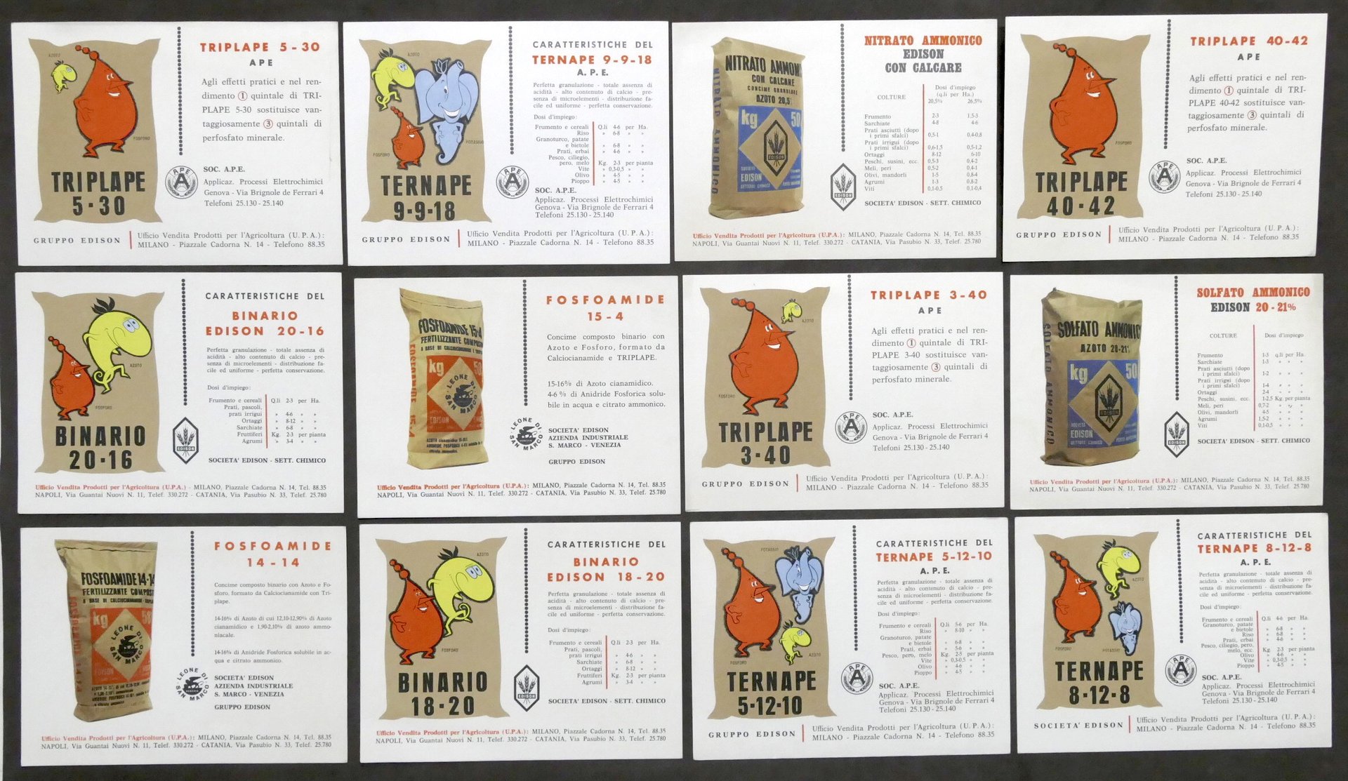 Lotto 12 brochure Pubblicità Concimi - Gruppo Edison - anni '50 12 cartoncini 16 x 12 cm. stampati fronte/retro Lingua italiana. Condizioni molto buone.