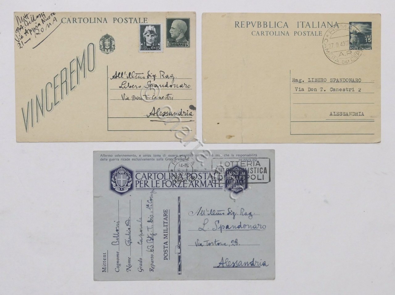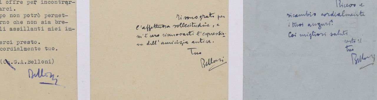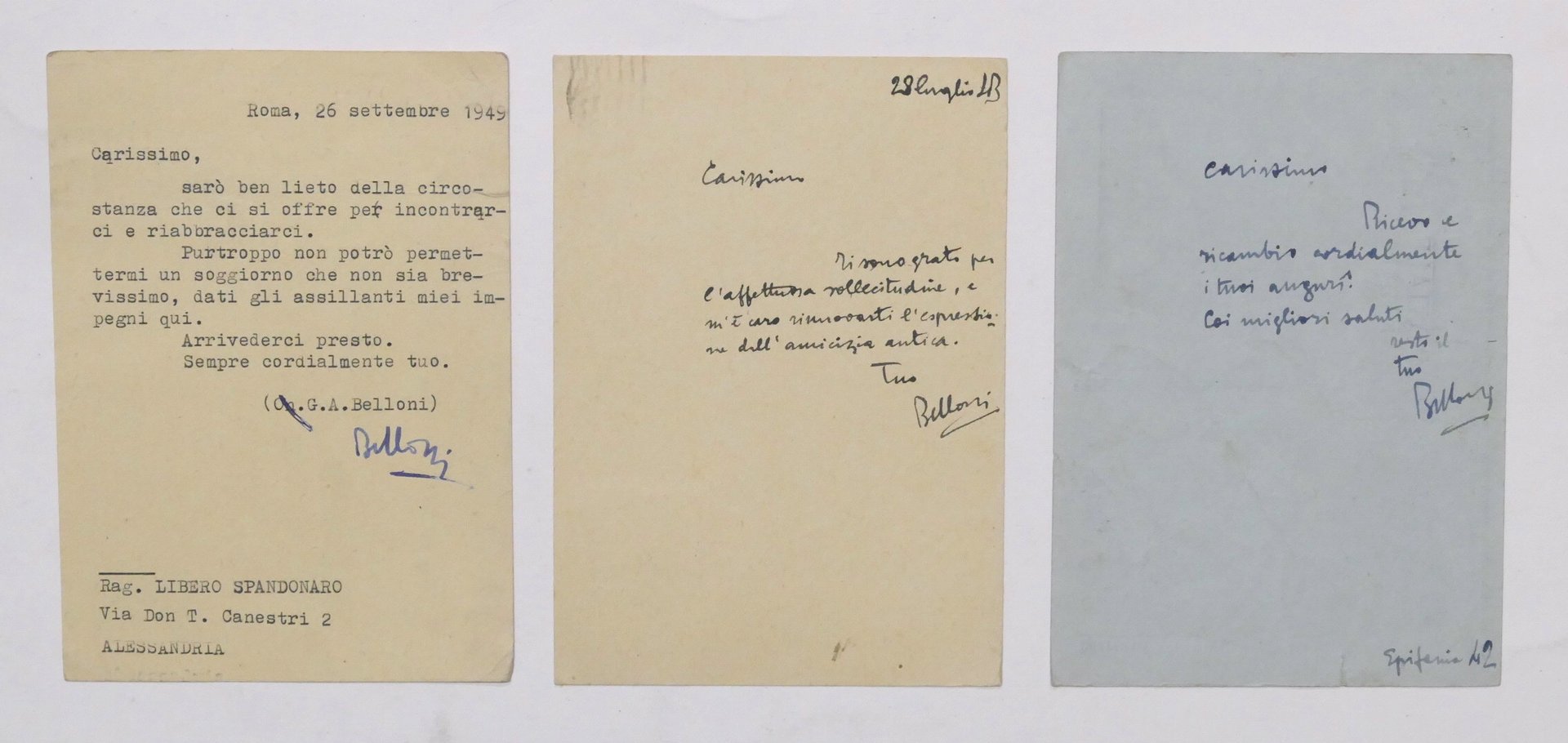 Lotto 3 autografi deputato Giulio Andrea Belloni a Libero Spandonaro - anni '40