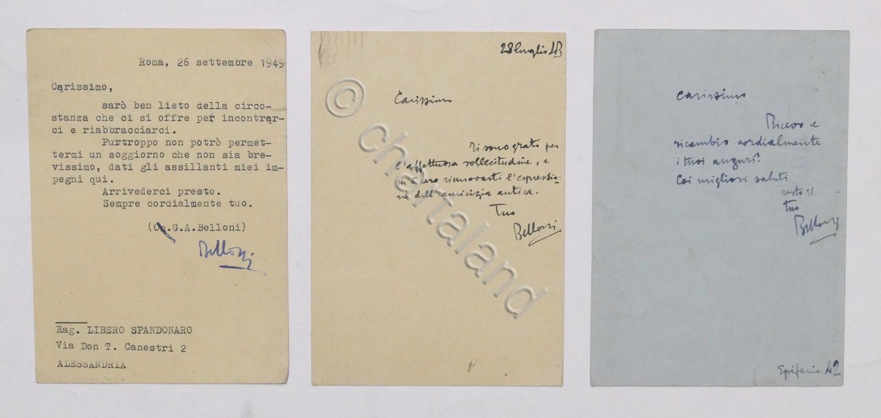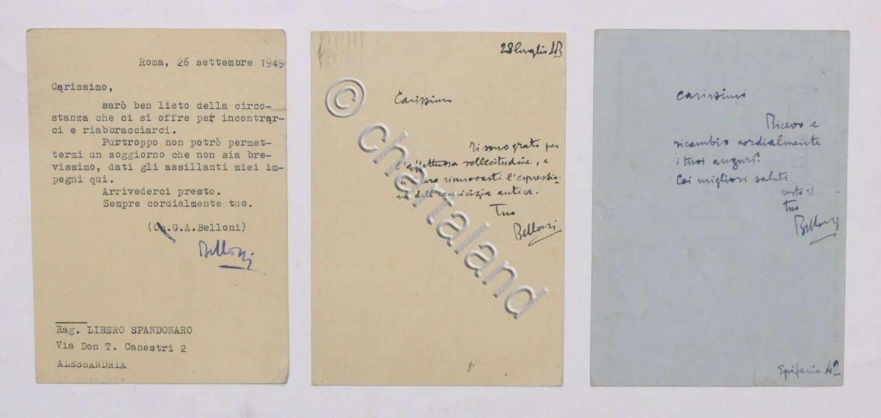 Lotto 3 autografi deputato Giulio Andrea Belloni a Libero Spandonaro - anni '40 | Libri antichi e moderni |