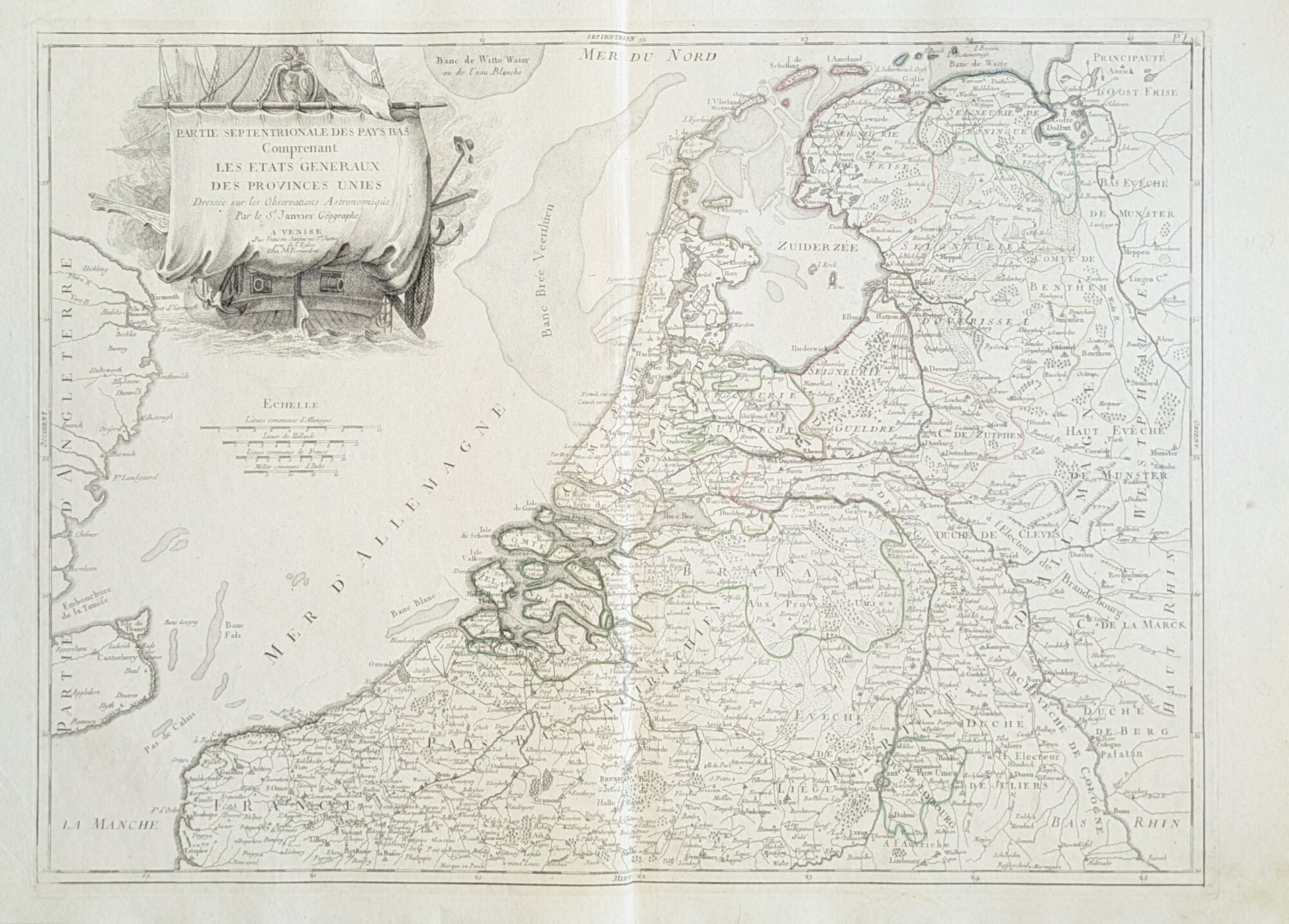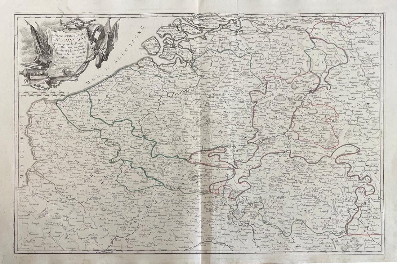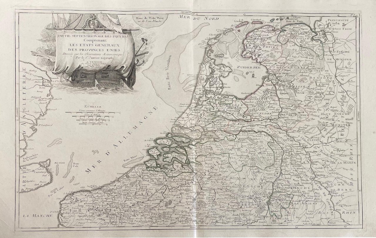 Lotto di due mappe dall' “Atlas Universel” stampato a Venezia nel 1776 e nel 1784, comprendente:- Partie septentrionale des Pays Bas comprenant les Etats Generaux des provinces unies.- Partie meridionale des Pays Bas qui comprend les provinces de Brabant, Gueldre, Limbourg, Luxembourg, Hainaut, Namur, Flandre, Cambresis et Artois.