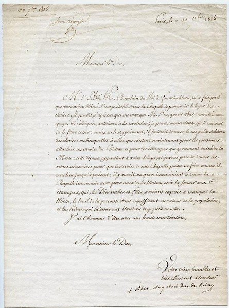 Folio. 1 p. To the Duc de Coigny at Fontainebleau on the issue of renting out church pews.