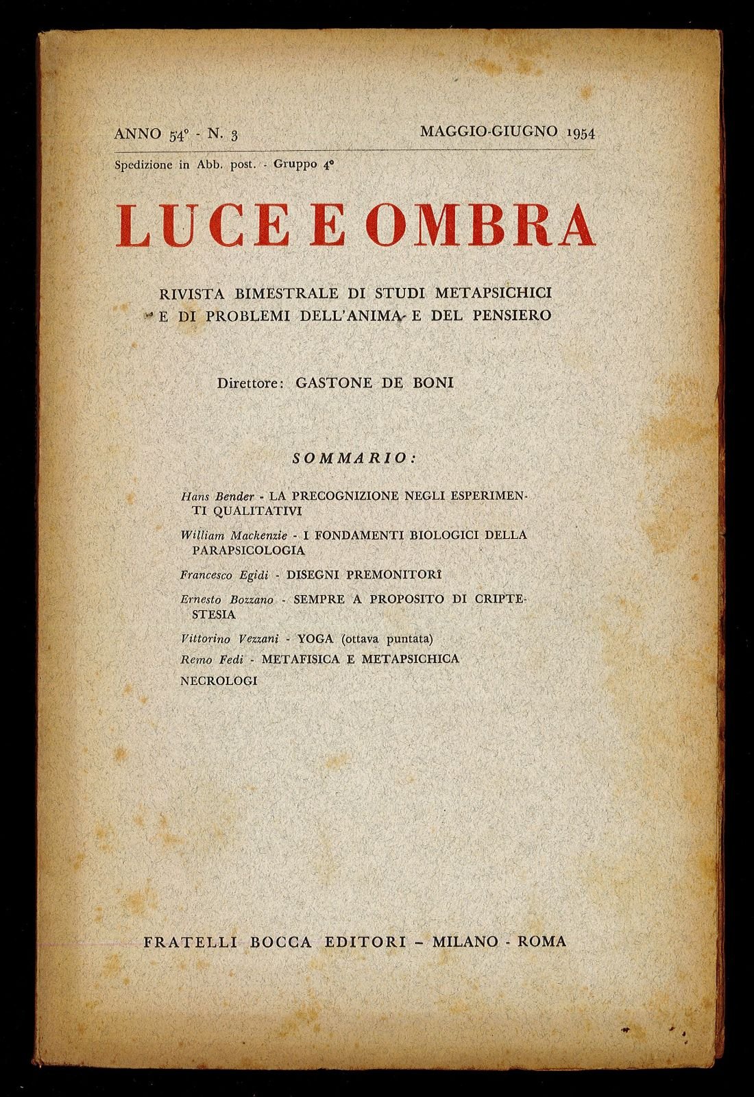 Opuscolo vintage. Rivista bimenstrale di studi metapsichici e di problemi dell'anima e del pensiero. Argomento: medicina. Autore: De Boni Gastone (direttore). Editore: Fratelli Bocca. Luogo: Milano. Anno: 1954. Formato: in-8°. Pagg: n.d. Legatura: brossura. Conservazione: buona. Non rifilato