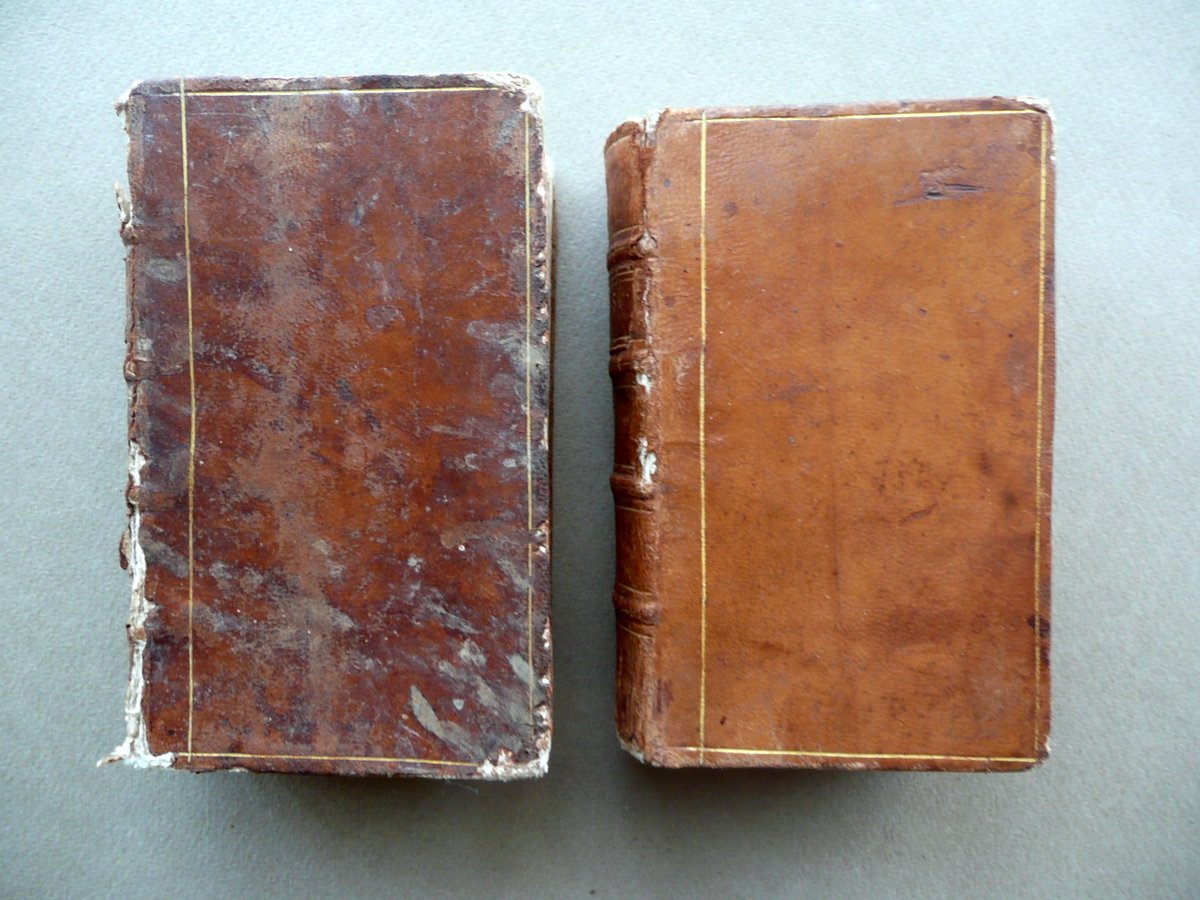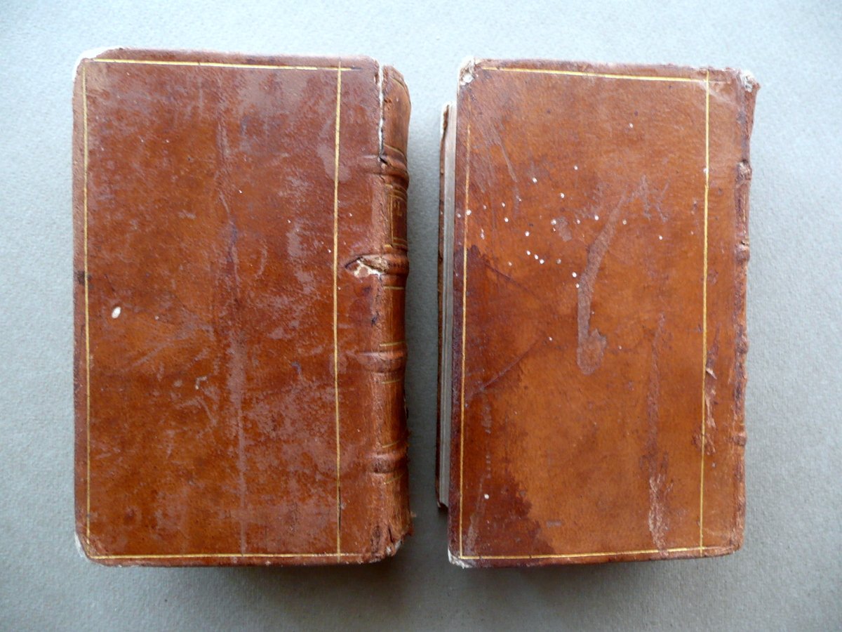 Seicentina, Ludovici Blosii Belgae, Abbatis Laetiensis Ord. S. Benedicti Viri Operum Pars III - Pars V (due tomi) Typis Andreae Apergeri, Augusta 1626; cm 12,5x8, pp. [10]; 810 (pars III); pp. [5]; 715 (pars V), entrambi con qualche piccolo fregio e capolettera incisi; frontespizi entrambi con una piccola incisione in b/n. Legatura d'epoca in piena pelle con titolo e qualche fregio impressi in oro al dorso con nervature (il titolo è entro tassello). Due tomi, corrispondenti rispettivamente alla parte III e V. Prima carta bianca di ciascun tomo con un'annotazione d'epoca e con applicato ex libris a stampa del precedente proprietario. Testi in latino. Condizioni di conservazione Tomi entrambi complessivamente ben conservati con tracce d'uso e del tempo; coperte con alcuni leggeri aloni, minime tracce di sporco e mancanze generalmente di piccole dimensioni (vedi foto); cerniere anteriori con qualche piccola parziale fessurazione, restaurate per mezzo d'incollatura. Interni buoni con alcune piccole lievi bruniture; angoli di qualche pagina con una piccola pieghetta o traccia di pieghetta; alcune delle ultime pagine della parte V con un paio di piccole leggere ombre di gore agli angoli, le quali non interessano il testo. Due tomi, corrispondenti rispettivamente alla parte III e V. Testi in latino. Per un elenco delle opere contenute nei due tomi vedi foto indice. SETT115.L10979 N P