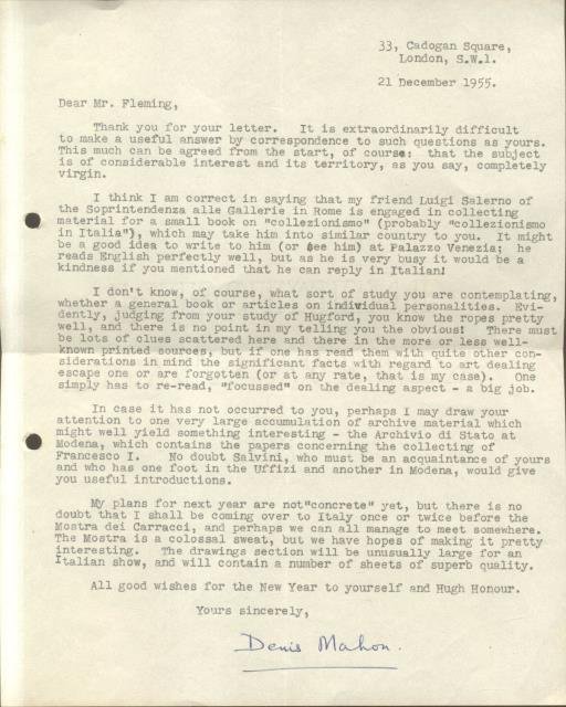 Lunga lettera dattiloscritta, in inglese, datata 21 dicembre 1955, con firma autografa estesa. Mahon fornisce a Fleming preziosi suggerimenti per un suo progetto di lavoro sul collezionismo di opere d'arte. Codice libreria 173031.
