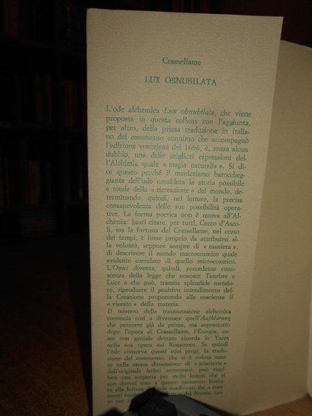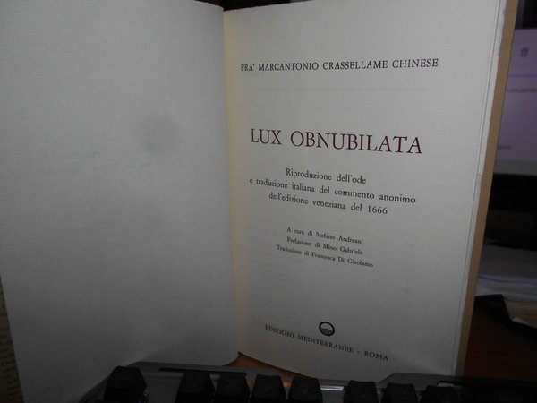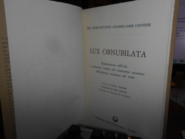 Crassellame. Roma, Edizioni Mediterranee, 1980. LUX OBNUBILATA. Prima traduzione in italiano del Commento Anonimo del 1666. A cura di Stefano Andreani. Prefazione di Mino Gabriele. In-8°, cart. edit. 149 pp. con alcune illustrazioni n.t. Come nuovo. Uff. stanzetta mob. a sinistra sotto finestra.