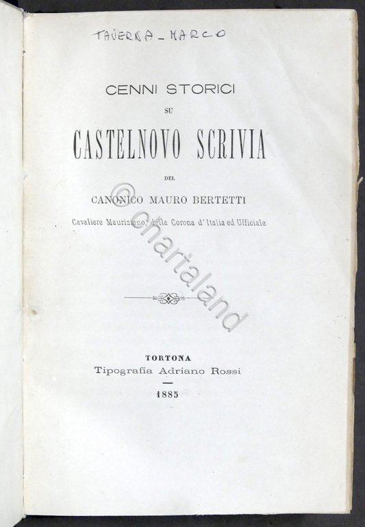 Cenni storici su Castelnovo Scrivia del canonico Mauro Bertetti Tortona, Tipografia Adriano Rossi, 1^ ed. 1885 pag. IV, 223 Copertina rigida non coeva. Testo in italiano. Condizioni molto buone. Legatura restaurata, sguardie rifatte.