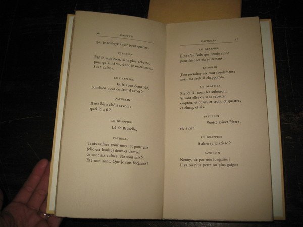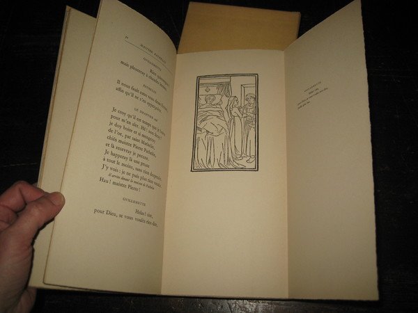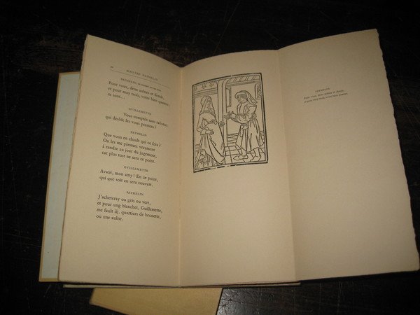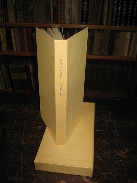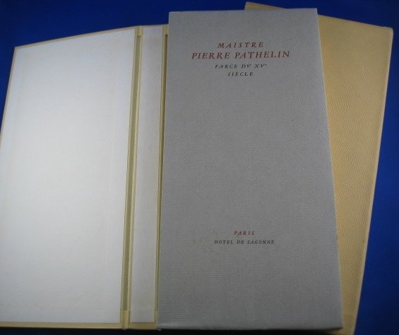 In-8° stretto (255x124mm), pp. 129, (2), brossura editoriale a risvolti con titolo in rosso e nero, camicia e astuccio editoriale telati. 6 tavv. ripiegate f.t. riproducenti xilografie che adornavano edizioni antiche dell'opera. Ex libris. Perfetto esemplare. Tiratura complessiva di 1000 esemplari numerati (n° 681 della tiratura di 675 su 'vélin crème des Papeteries de Lana'). Introduzione di Jean Porcher. Raffinata edizione talloniana di Parigi di questo anonimo capolavoro del teatro comico medievale, felice satira della cancelleria parigina e delle istituzioni giudiziarie della capitale francese nel XV secolo. Pellizzari, n. XXI.