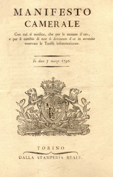 MANIFESTO CAMERALE CON CUI SI NOTIFICA CHE, PER LE MONETE D'ORO, E PER IL CAMBIO DI ESSE, SI DOVRANNO D'OR IN AVVENIRE OSSERVARE LE TARIFFE INFRATENORIZZATE. In data 5 marzo 1792.