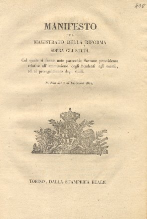 Manifesto del magistrato della Riforma sopra gli Studi, col quale si fanno note parecchie Sovrane provvidenze relative all'ammessione degli studenti agli esami, ed al proseguimento degli studi . 7 dicembre 1821. | Libri antichi e moderni | Stati Sardi - Provvidenze.