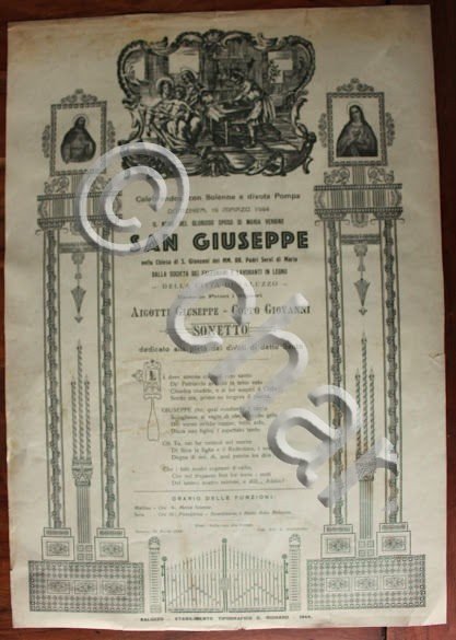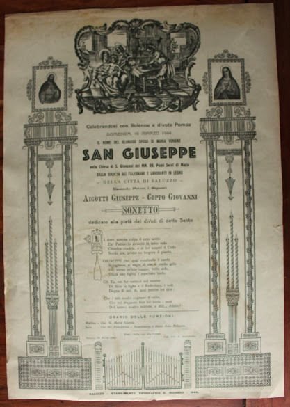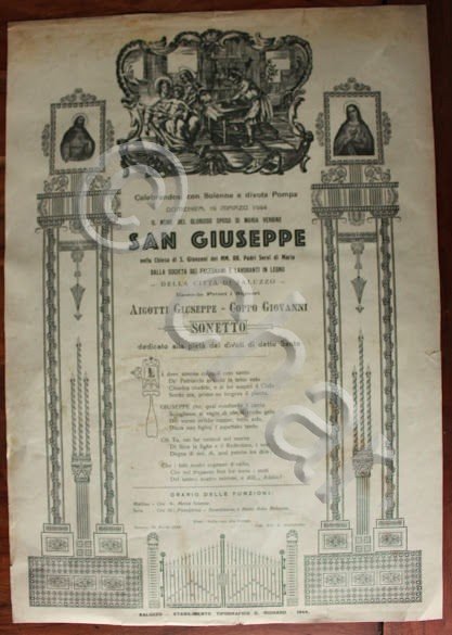 Manifesto devozionale - dedicato a San Giuseppe - parrocchia della città di Saluzzo. Con sonetto dedicato ai devoti del Santo. Stampa - litografia realizzata dallo stabilimento tipografico G. Richard di Saluzzo. Stampato nel 1944. Con ricco impianto iconografico e decorativo. Dimensioni: foglio 340 x 485 mm. ca Per appassionati studiosi e collezionisti