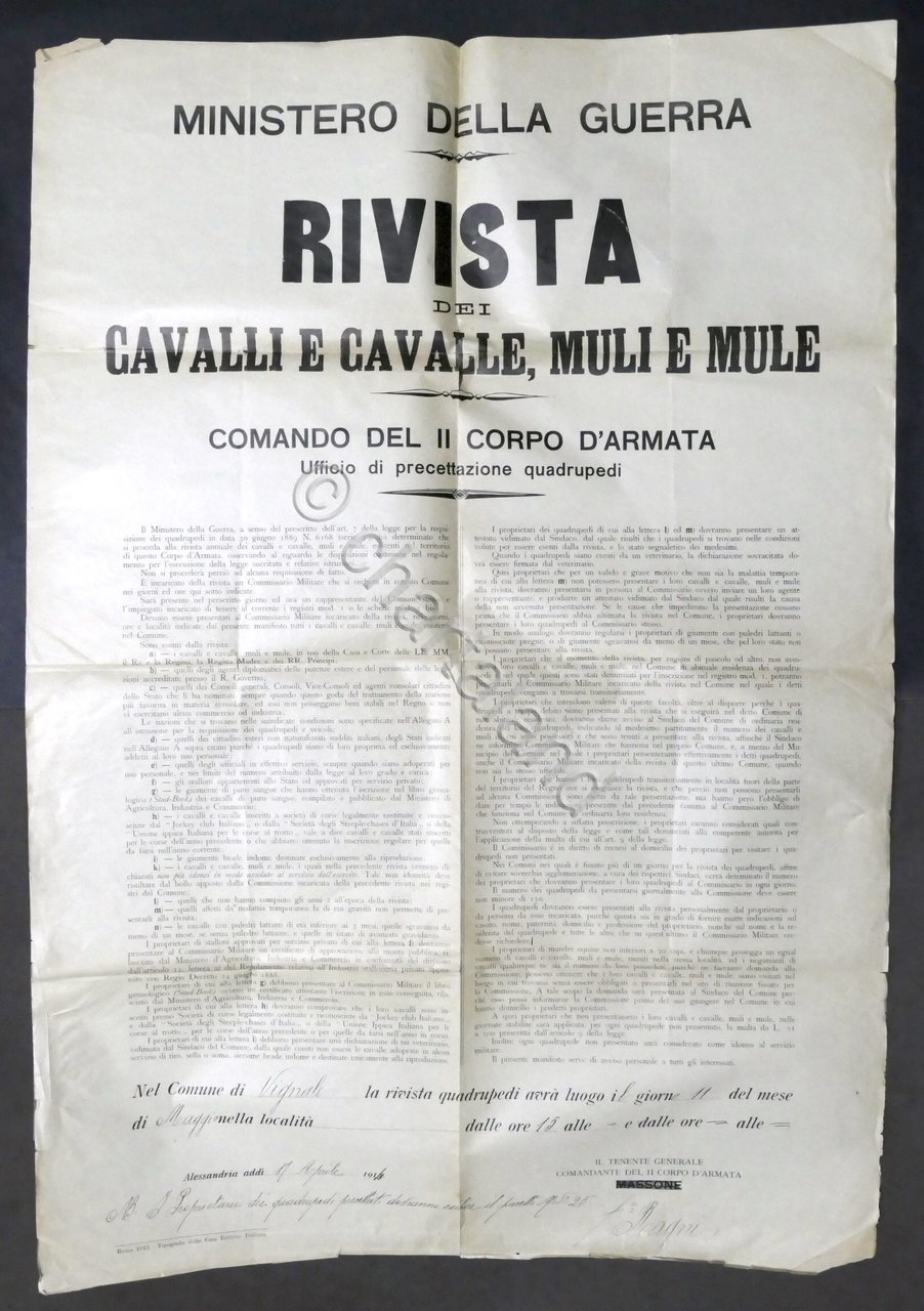 Manifesto Ministero della Guerra - Rivista dei cavalli e cavalle, muli e mule - Comando del II Corpo d'Armata - Comune di Vignale - 1914 Un foglio più volte ripiegato, dimensioni: 60 x 88 cm ca. Lingua italiana. Condizioni generali buone. Qualche piccolo strappo.