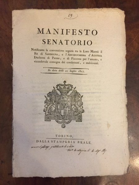 Manifesto Senatorio notificante la convenzione seguita tra le Loro Maestà il Re di Sardegna, e l'Arciduchessa d'Austria Duchessa di Parma, e di Piacenza per l'arresto, e vicendevole consegna dei condannati, e malviventi. In data delli 21 luglio 1817