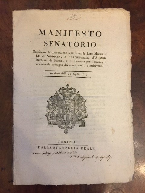 Manifesto Senatorio notificante la convenzione seguita tra le Loro Maestà il Re di Sardegna, e l'Arciduchessa d'Austria Duchessa di Parma, e di Piacenza per l'arresto, e vicendevole consegna dei condannati, e malviventi. In data delli 21 luglio 1817 | Libri antichi e moderni |