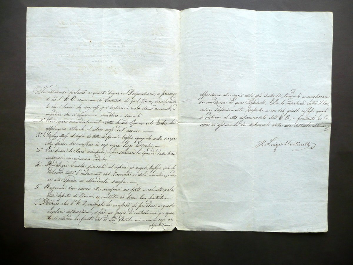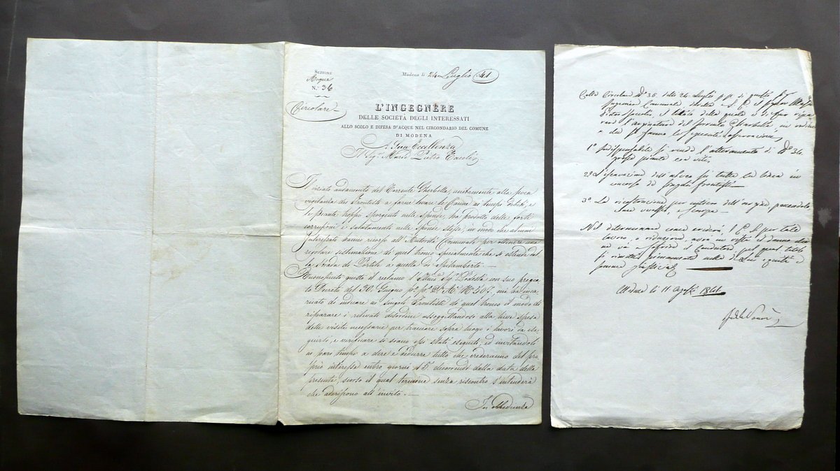 Disposizioni manoscritte, L'Ingegnere delle Società degli interessati allo scolo e difesa d'acque nel circondario del Comune di Modena Circolare contenente disposizioni per la manutenzione, gestione e riparazione del tronco che si estende dalla strada di Portile a quella di Spilamberto Datata Modena, 24 luglio 1841 1841; disposizioni interamente manoscritte, redatte su bifolio precompilato a stampa; testo disposto su tre facciate. Firma che ne certifica la validità al termine del testo. Cm 30,5x21,5. Accluso ulteriore foglio manoscritto per integrazione delle disposizioni rilasciate in precedenza, datato 11 agosto 1841 (vedi foto). Condizioni di conservazione Esemplare ben conservato con tracce d'uso, leggere tracce di pieghe di conservazione, minuscole poco visibili bruniture e pressoché trascurabili accenni di sporco. Interessante manoscritto che contiene disposizioni per la manutenzione e riparazione del tratto del tronco che si estende dalla strada di Portile a quella di Spilamberto". Disposizioni suddivise in cinque punti. Accluso ulteriore foglio manoscritto che integra le disposizioni rilasciate in precedenza, datato 11 agosto 1841 (vedi foto). SC03.D12520 N "