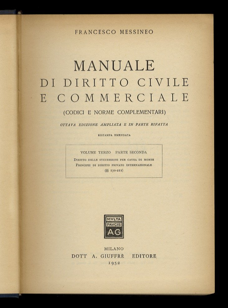 Manuale di diritto civile e commerciale. Articoli 1-211 + Indici. VIII edizione. | Libri antichi e moderni | Messineo Francesco.