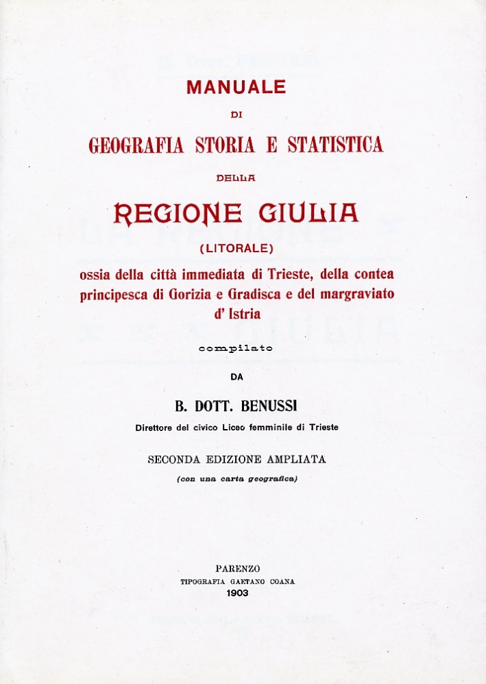 Manuale di geografia, storia e statistica della Regione Giulia (litorale), ossia della città immediata di Trieste, della Contea principesca di Gorizia e Gradisca e del margraviato d'Istria, Trieste, Italo Svevo, 1987 | Libri antichi e moderni | Benussi Bernardo