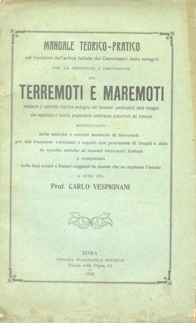 MANUALE TEORICO PRATICO PEL RIPRISTINO DELL'ANTICO ISTITUTO DEI COMMISSARI DELLE VORAGINI PER LA PREVISIONE E PREVENZIONE DEI TERREMOTI E MAREMOTI MEDIANTE IL CONTROLLO INTUITIVO ENDOGENO DEI FENOMENI GEODINAMICI DELLE VORAGINI CHE SEGNALANO IL LAVORIO PREPARATORIO SOTTERRANEO PRECURSORE DEI TREMUOTI. Rintracciato nelle antiche e recenti memorie di terremoti per tali fenomeni vaticinati e seguiti con precisione di luoghi e date da epoche antiche ai recenti terremoti italiani e completato colle fasi solari e lunari reggenti le maree che ne segnalano l'esodo. | Libri antichi e moderni | Vespignani Carlo.