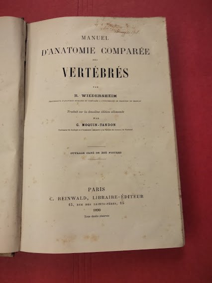 Manuel d'anatomie comparee des vertebres. Traduit par G.Moquin - Tandon. | Libri antichi e moderni | Wiedersheim R.