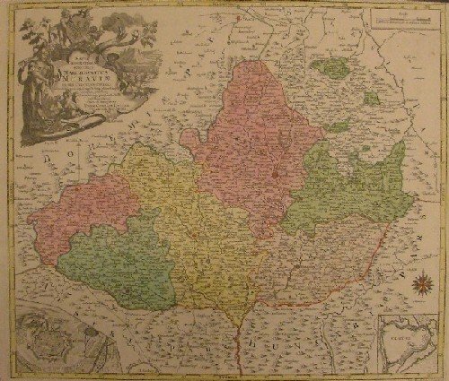 Carta geografica incisa in rame, a colori, di cm. 49 x 57. Pregevolissimo cartiglio animato in alto a sinistra. Scala in alto a destra. Riquadri, in basso a sinistra ed a destra, rispettivamente raffiguranti le piante di Brunn e Olmutz. Rifilato il marg. sup.