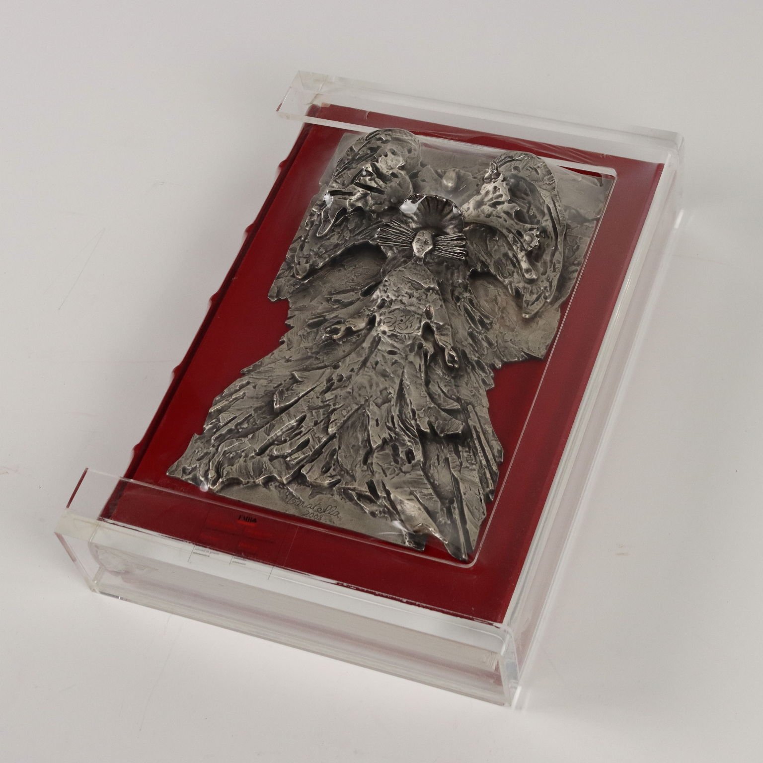 Esemplare in perfetto stato di conservazione: il volume con legatura in piena pelle con titoli in oro al dorso a cinque nervi e scultura al piatto è conservato nel rivestimento protettivo in cellophane e inserito nella sua custodia in plexiglass