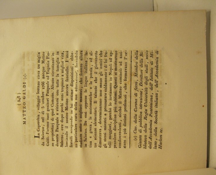 In 8, pp. 343-347 + (1b). Br. rifatta con carta d'epoca. Stralcio dagli Atti del Real Istituto d'incoraggiamento alle scienze naturali di Napoli, tomo V. Cenni biblio-biografici relativi alla vita e agli studi di Matteo Galdi nato a Coperchia di Pellezzano, nel Salernitano nel 1765, letterato ed erudito. In fine compare l'elenco delle opere edite ed inedite.